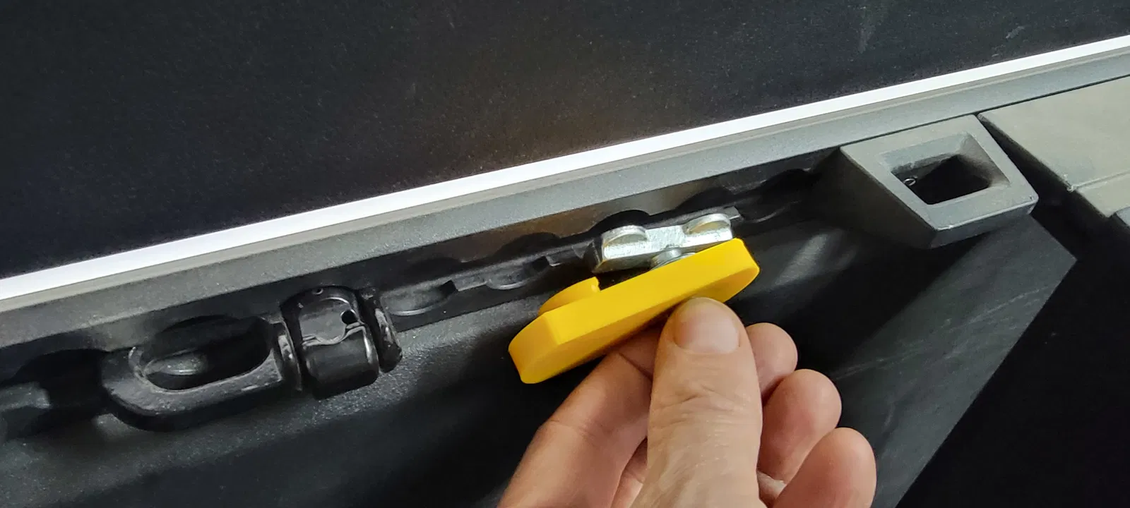 Mình có một phụ kiện cần phải giữ cố định sáu cái stud cùng một lúc. Đây là ống lót (sleeve) mà bạn có thể gắn vào các stud trên thanh L-Track để khóa chúng tại chỗ, giúp việc lắp đặt trở nên nhẹ nhàng và đỡ vất vả hơn nhiều. Có ba phiên bản cho bạn lựa chọn: phiên bản phẳng, phiên bản phẳng mỏng, và một phiên bản nghiêng 10 độ. Đa số mọi người sẽ cần dùng bản phẳng mỏng. Riêng phiên bản nghiêng được thiết kế cho một phụ kiện chuyên dụng dành cho Cybertruck, vì các vách bên trong của nó có độ nghiêng 10 độ.
