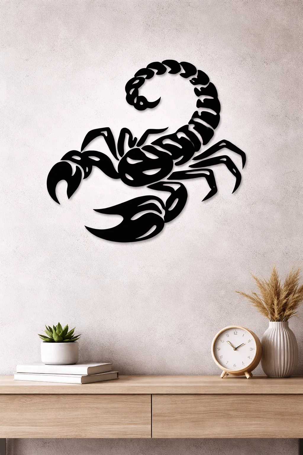 Thiết kế này nổi bật với hình bóng con bọ cạp mang phong cách tối giản và hiện đại, cực kỳ phù hợp để trang trí phòng ngủ, phòng khách, văn phòng hay góc làm việc sáng tạo. Khi in bằng nhựa PLA đen, sản phẩm tạo nên độ tương phản thị giác mạnh mẽ và vẻ ngoài sang trọng, đồng thời vẫn giữ được độ nhẹ giúp dễ dàng treo lắp.