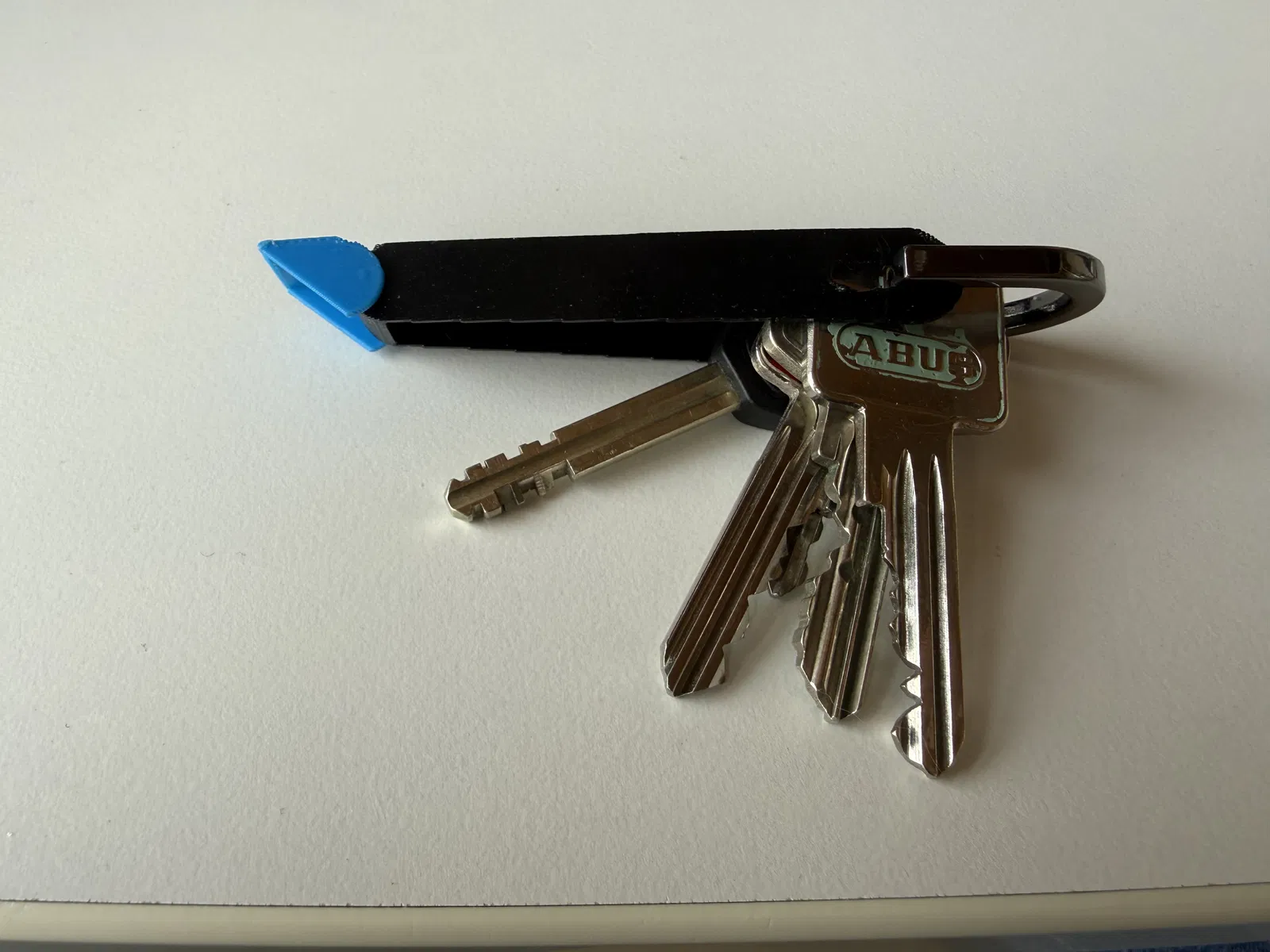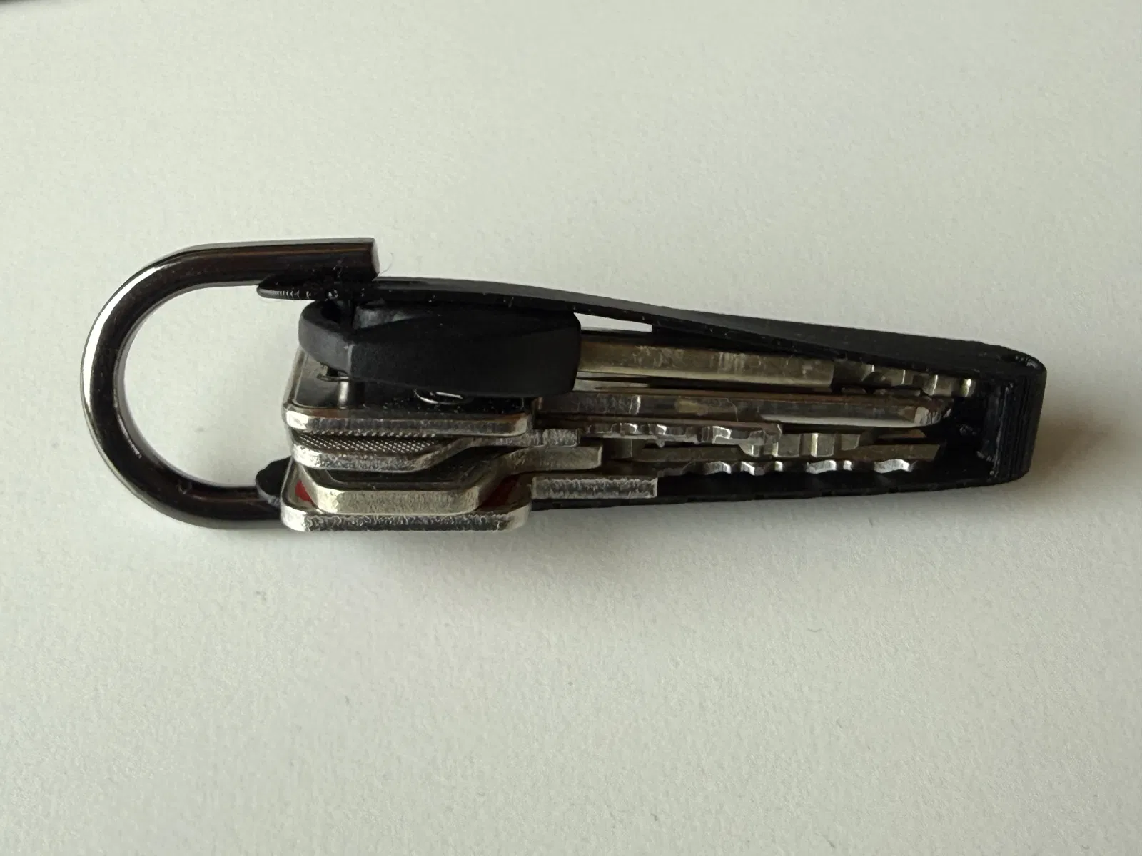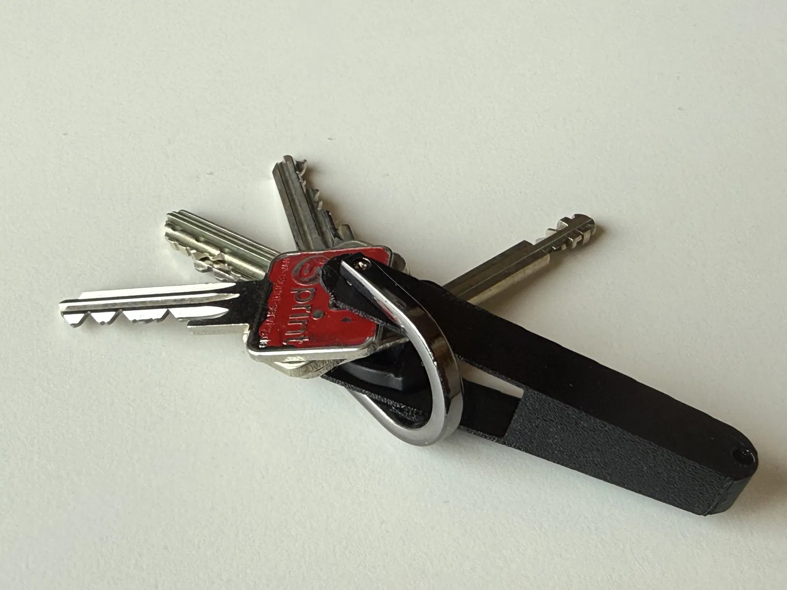 Bạn chỉ cần đẩy các chìa khóa vào trong phần vỏ bọc hình phễu. Lực ma sát và độ căng của nhựa in dẻo sẽ ép chặt và giữ chúng ở yên một chỗ.