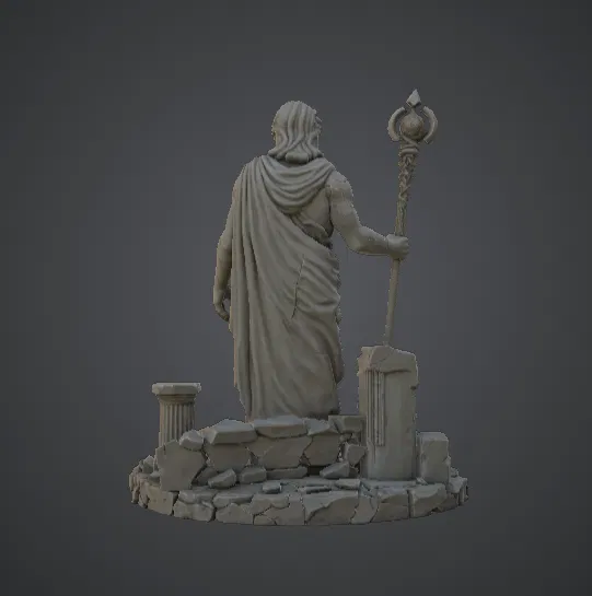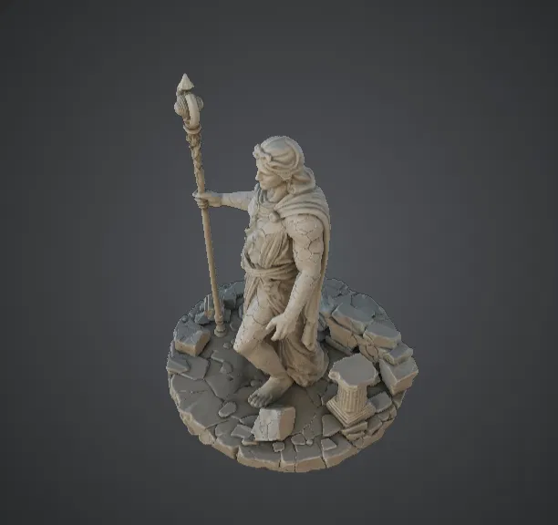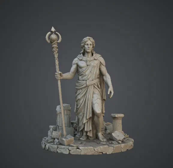 Tượng Thần Cổ Đại này đại diện cho một vị thần huyền thoại đầy quyền năng, bước ra từ đống đổ nát của một nền văn minh đã bị lãng quên. Nhân vật đứng đầy tự tin giữa những cột đền thờ gãy đổ và đá nứt, tay cầm một cây trượng được chạm khắc tinh xảo, tượng trưng cho quyền năng thần thánh và sức mạnh cổ xưa. Những dải áo choàng cùng tỷ lệ chuẩn mực kiểu cổ điển mang đến cho bức tượng một vẻ uy nghiêm vượt thời gian, gợi nhớ đến các tác phẩm điêu khắc thần thoại xa xưa. Thiết kế này kết hợp hài hòa giữa chủ đề giả tưởng và phong cách tượng cổ điển, làm nổi bật các chi tiết nếp gấp vải, bề mặt đá cùng các yếu tố kiến trúc đổ nát ở phần đế. Tư thế điềm tĩnh và đầy uy quyền của nhân vật tạo nên cảm giác như một vị thần hoặc người anh hùng huyền thoại đang canh giữ những vùng đất linh thiêng.