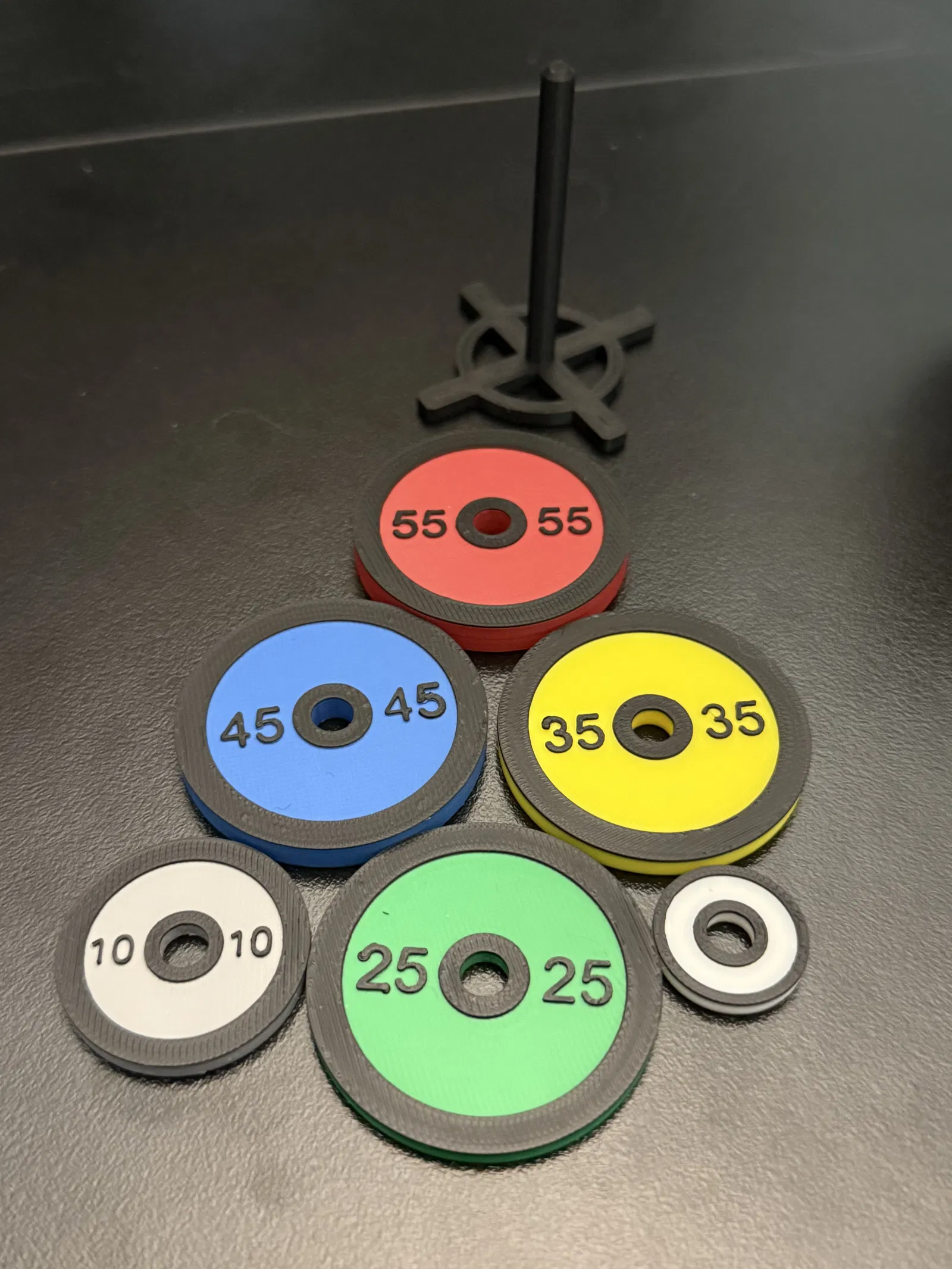 Mình thiết kế mô hình bộ tạ CrossFit này vì thấy các mẫu trên mạng hầu hết chỉ có đơn vị kilogram, trong khi bạn mình lại muốn bộ tạ tính theo pound (lbs) và có màu sắc đúng chuẩn như ở phòng gym của cô ấy. Phần thanh đòn được làm từ que gỗ 3/16" (tô màu đen bằng bút lông), chi phí chỉ khoảng 1 đô la vì in 3D phần thanh trụ thường rất yếu và dễ gãy. Hy vọng mọi người thích nó nhé!