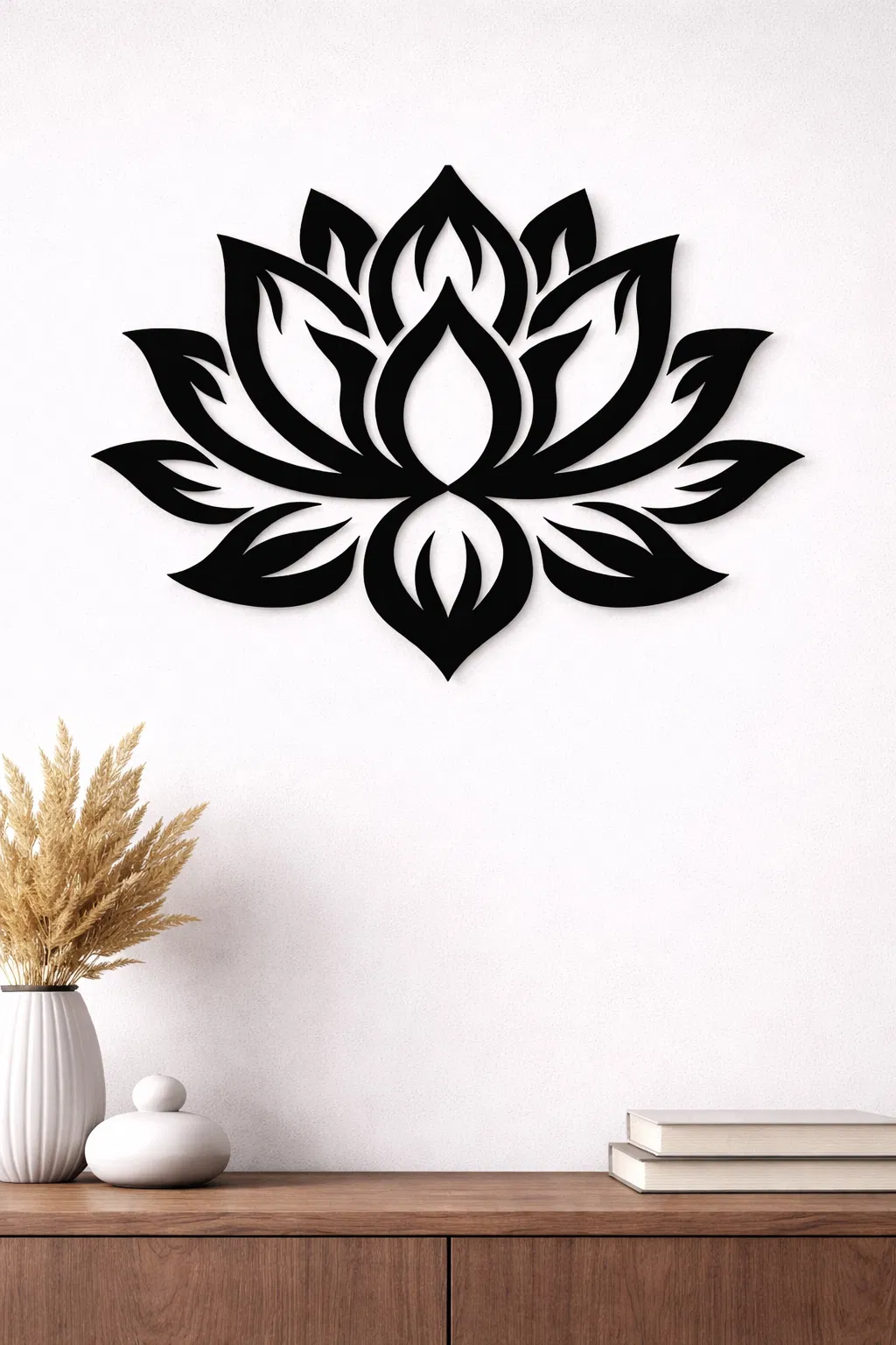 Mẫu thiết kế nổi bật với hình bóng hoa sen mạnh mẽ, các chi tiết cắt tỉa tinh tế tạo nên một bố cục cân xứng. Lấy cảm hứng từ một trong những loài hoa linh thiêng và giàu ý nghĩa nhất, sản phẩm mang lại cảm giác bình yên, thu hút cho bức tường, rất phù hợp để trang trí phòng khách, phòng ngủ, studio, phòng tập yoga, văn phòng hoặc làm quà tặng.