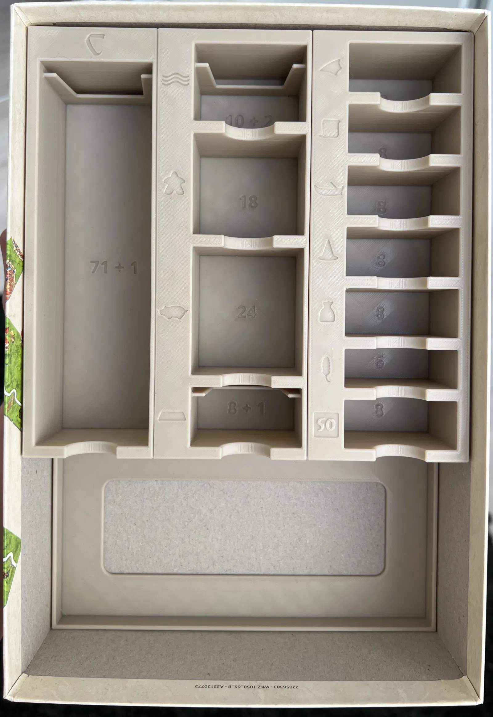 Giải pháp lưu trữ thông minh giúp bạn gói gọn toàn bộ nội dung của Carcassonne Big Box (V3.0) vào trong hộp game cơ bản nhỏ gọn hơn. Thiết kế tối ưu, dễ lấy miếng ghép và có ký hiệu riêng cho từng bản mở rộng.