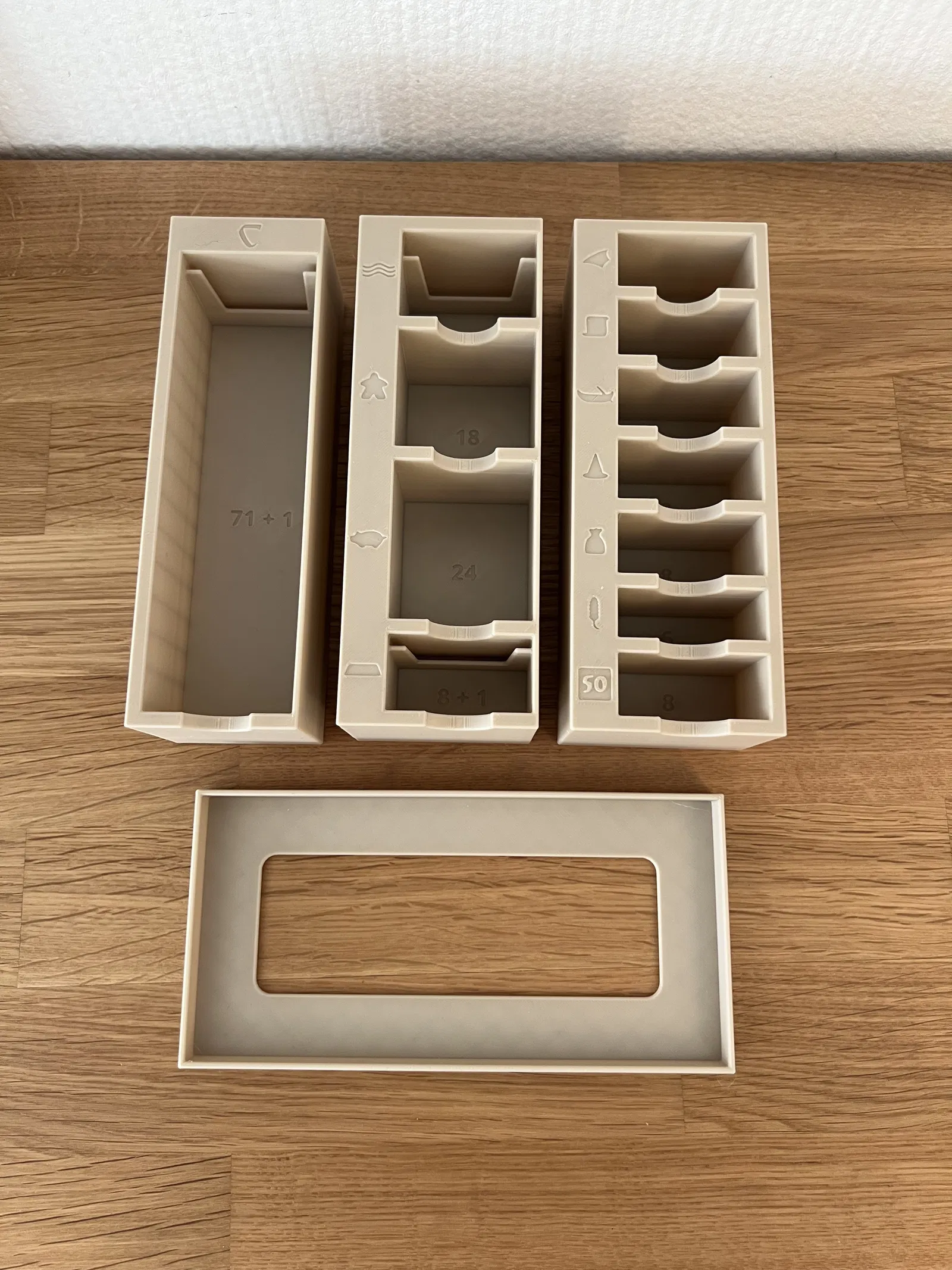 Hộp Big Box gốc vốn dĩ quá cồng kềnh và rất bất tiện khi mang đi xa. Với bộ khay này, bạn có thể tinh gọn tất cả vào chiếc hộp game gốc nhỏ hơn. Mỗi khay đều có khe riêng cho từng bản mở rộng, kèm theo biểu tượng được khắc bên cạnh và số lượng miếng ghép được khắc dưới đáy. Các khe này được thiết kế với dung sai rộng và có phần cắt bo tròn, giúp bạn lấy miếng ghép ra cực kỳ dễ dàng.