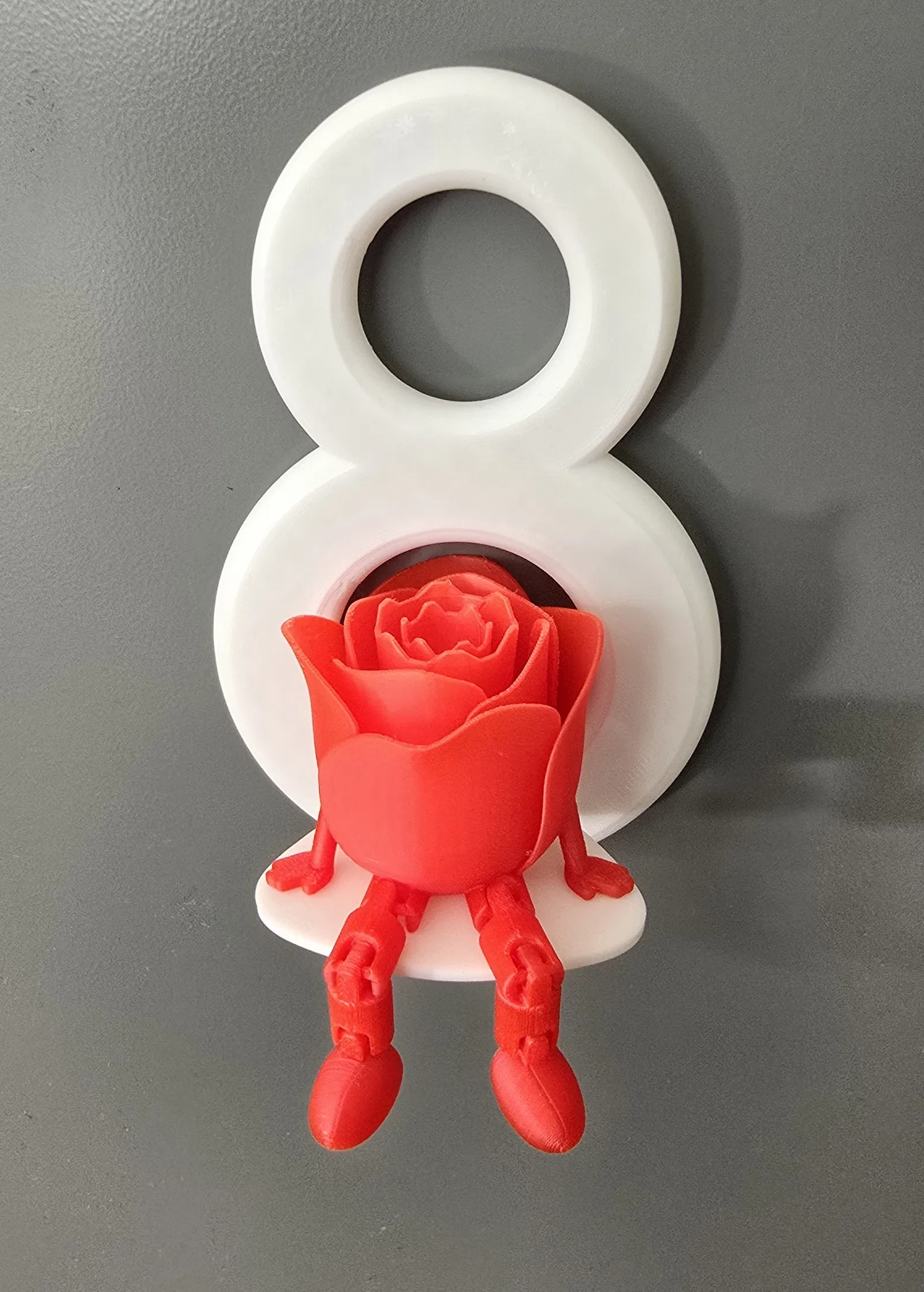 Mẫu in này là một món đồ trang trí nhỏ xinh dành cho ngày Quốc tế Phụ nữ 8/3, kết hợp giữa mô hình hoa hồng khớp nối (Articulated Rose) và hình số 8 cách điệu. Bạn chỉ cần dán nam châm 10x2 vào mặt sau để đính lên tủ lạnh là cực kỳ tiện luôn. Phần đế chỉ cần cắm vào lỗ có sẵn mà không cần dùng đến keo dán đâu nhé.