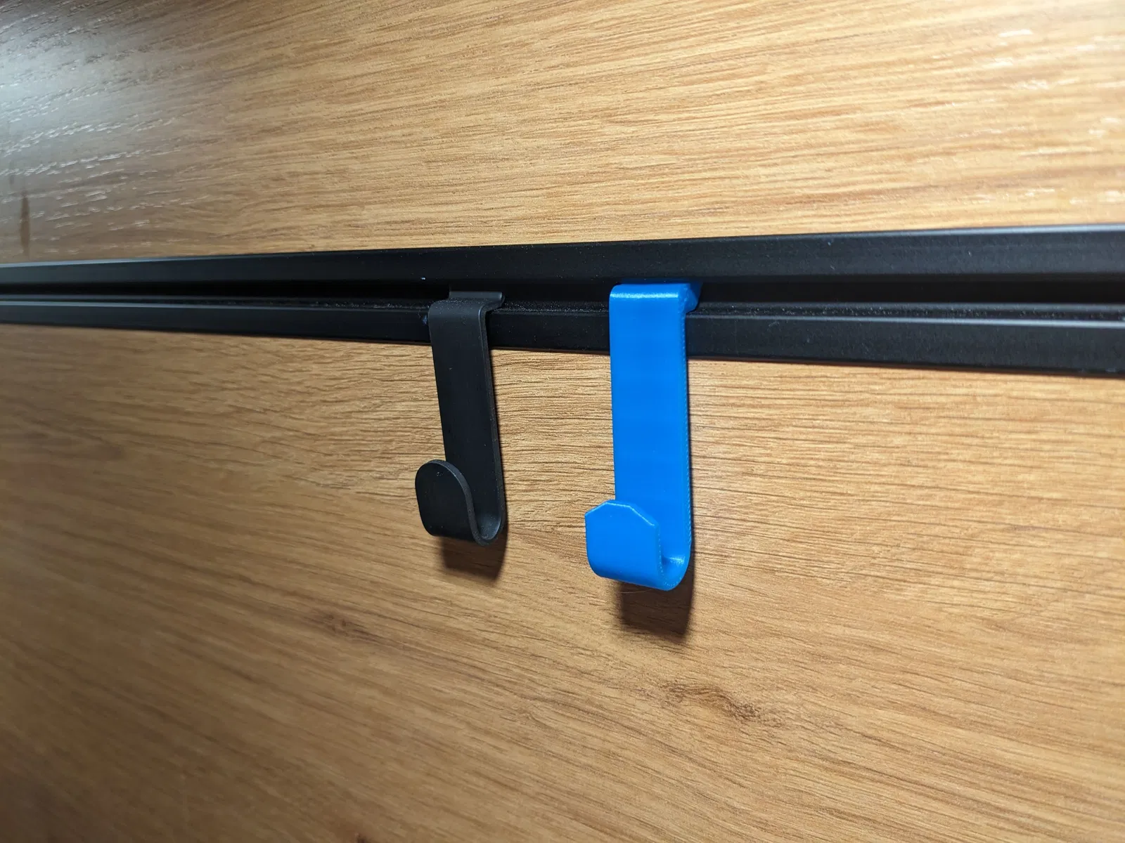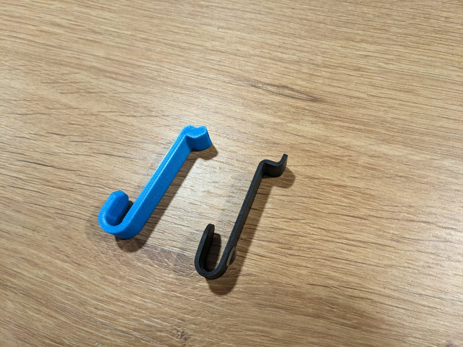 Phần kim loại màu đen là linh kiện gốc, loại này hay bị tuột khỏi khe cắm. Bản in 3D này được thiết kế lớn hơn ở phần khớp nối nên sẽ bám chắc hơn. Chất liệu PLA đủ cứng cáp để treo khăn lau hoặc miếng nhấc nồi.