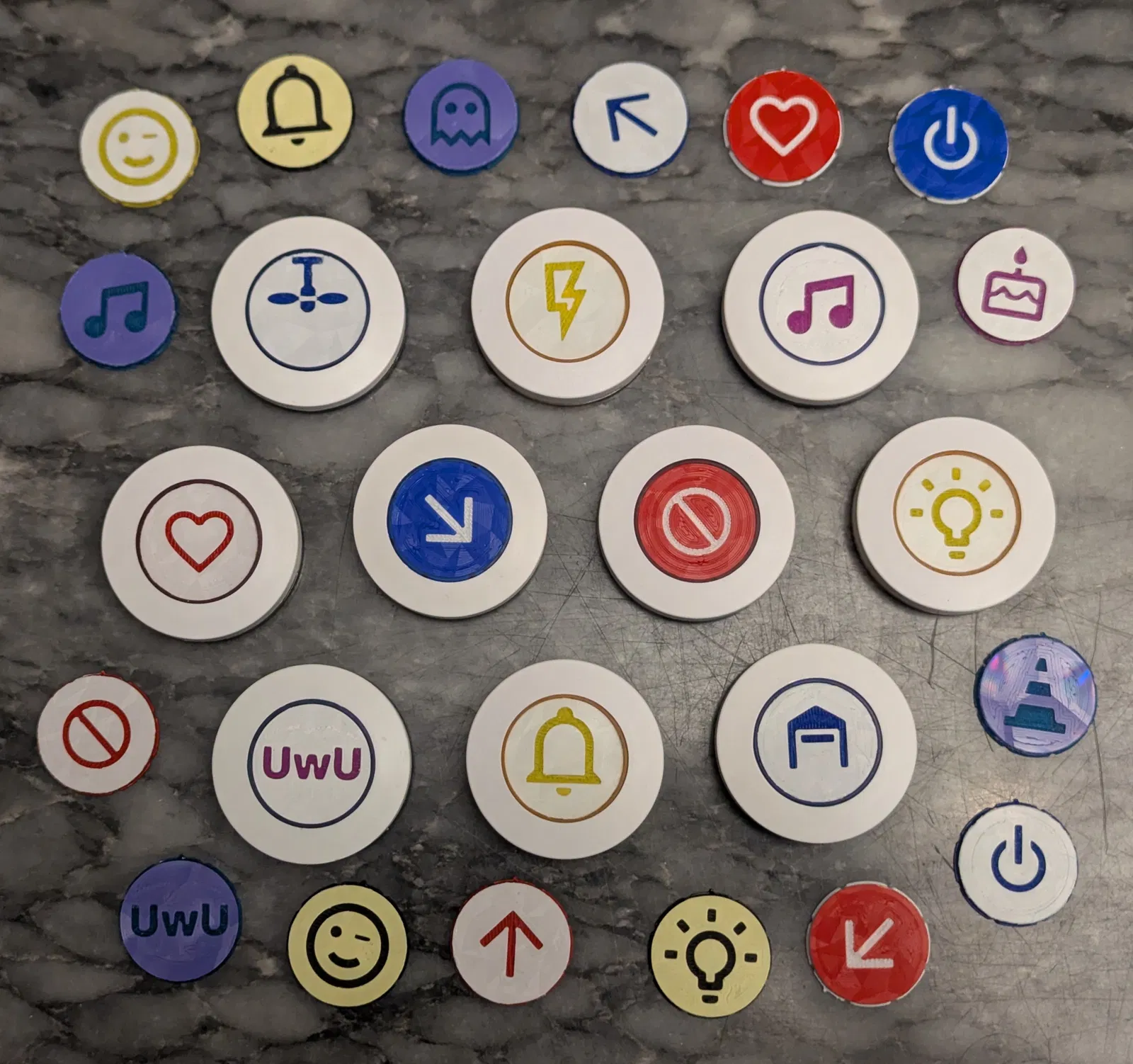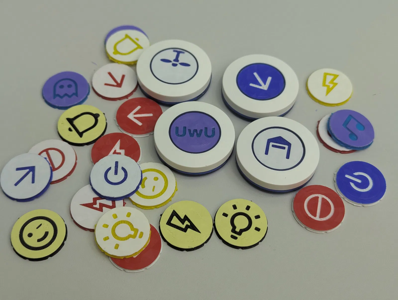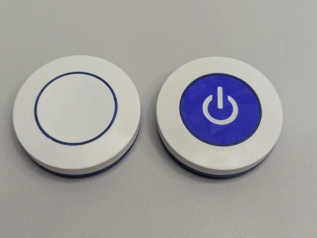Mấy cái nút này giá rẻ và sử dụng mã EV1527. Chúng thường có vỏ màu trắng với vòng nút màu đỏ, vàng, xanh lá hoặc xanh dương. Ngoài ra cũng có các phiên bản ZigBee với vỏ trông tương tự (một phiên bản là nút SOS), nhưng mình chưa mua thử vì giá không rẻ lắm. Nếu bạn nào có thử và thấy nó vừa thì cho mình biết nhé. Mình mới chỉ test phiên bản 433 MHz, nhưng mình đoán bản 315 MHz cũng y chang vậy thôi. Bạn có thể chỉnh sửa file trắng ngay trong slicer để thêm chữ tùy thích, độ sâu khoảng 0.4 mm là ổn áp nhất. Bạn cũng có thể dùng file OpenSCAD và sửa dòng 15. Cách này làm nhanh gọn lẹ mà vẫn hiệu quả. Bạn còn có thể dùng các file SVG như ở https://pictogrammers.com/library/mdi/ mà mình đã dùng cho các file 433mdi*. Mình khuyên là nên dùng tấm lót in (print plate) loại xịn một chút cho bề mặt đẹp, nhưng tùy bạn chọn thôi nha. Bộ thu 315/433 MHz của mô-đun công tắc relay có thể dễ dàng độ lại để biến thành bộ thu điều khiển từ xa ESPHome đa năng, nhờ đó mấy cái nút này có thể kết nối với HomeAssistant luôn.