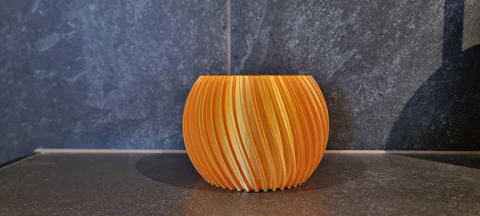Chiếc bình có dáng bầu bĩnh với miệng rộng và phần đáy hơi thon gọn. Điểm nhấn ấn tượng nhất chính là các đường gờ xoắn ốc—một loạt các đường gân dọc sắc nét chạy xoắn quanh thân bình đầy thanh thoát, tạo nên cảm giác chuyển động vô cùng sống động. Thông số in: Layer 0.20 mm, KHÔNG CẦN SUPPORTS.