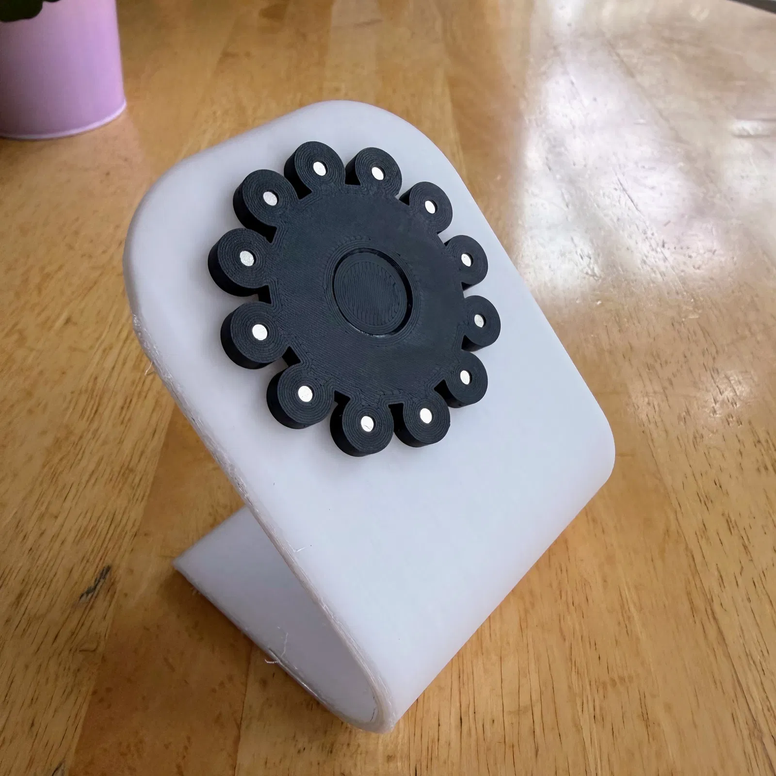 Các viên nam châm cần được đặt cùng chiều với nhau. Mình gợi ý bạn nên gắn thử vài viên rồi kiểm tra xem đã đúng chiều chưa bằng cách áp vào điện thoại trước khi lắp hết vào. Mỗi vòng tròn sẽ cần lắp hai viên nam châm 3x8mm. Nhờ vào đặc tính bám dính nhẹ của TPU, thiết kế này khá chắc chắn cho nhu cầu sử dụng thông thường. Lưu ý là nếu bạn không in bằng TPU thì khả năng giữ điện thoại sẽ kém hơn đấy.