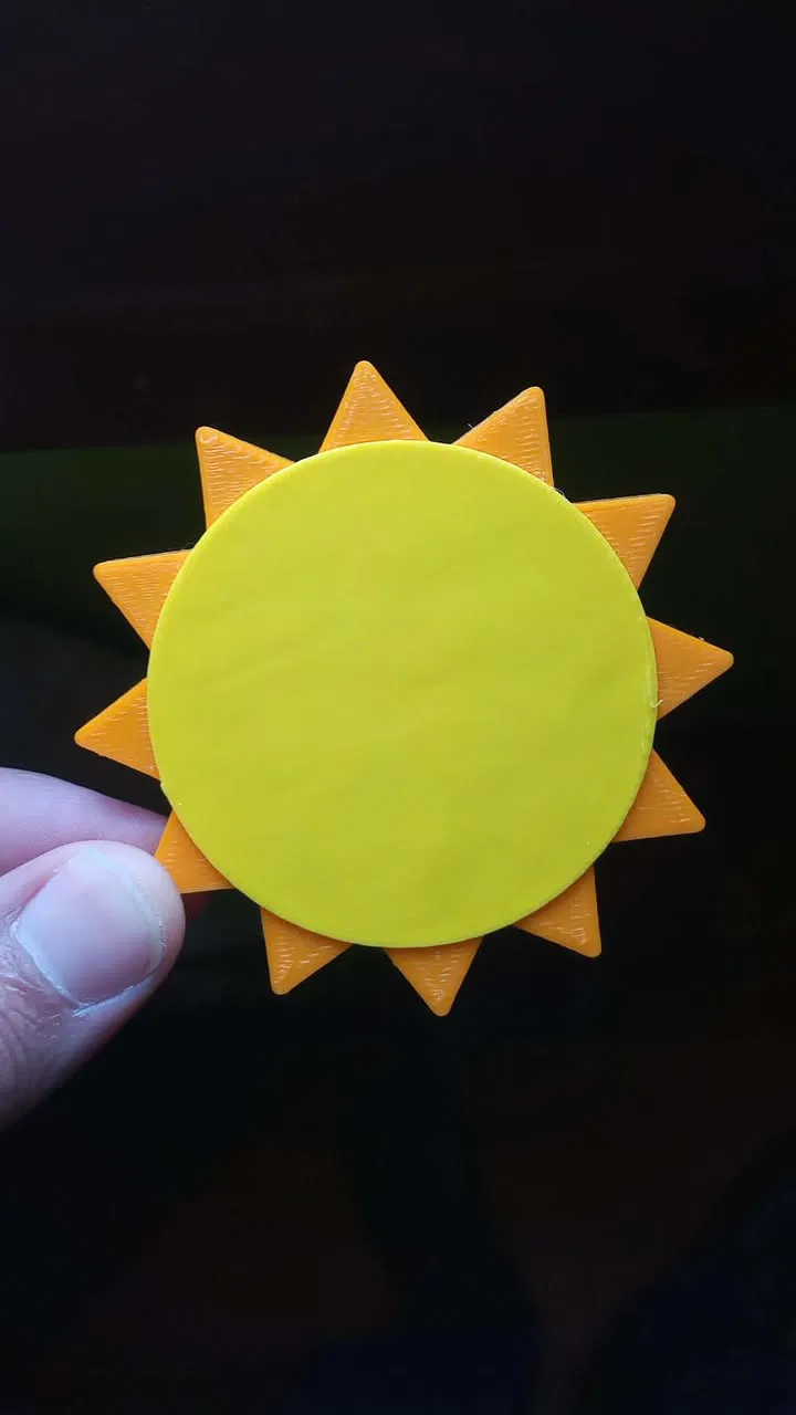 Sản phẩm được thiết kế với cấu trúc hai lớp đơn giản nhưng tinh tế, giúp việc in ấn 3D trở nên dễ dàng ngay cả với những người mới bắt đầu. Sự kết hợp giữa màu vàng tươi sáng ở tâm và các tia nắng màu cam xung quanh tạo nên hiệu ứng thị giác rất bắt mắt và sinh động. Đây là món đồ chơi trang trí nhỏ nhắn, phù hợp để tạo điểm nhấn vui nhộn cho không gian cá nhân hoặc làm quà tặng sáng tạo cho bạn bè, người thân.