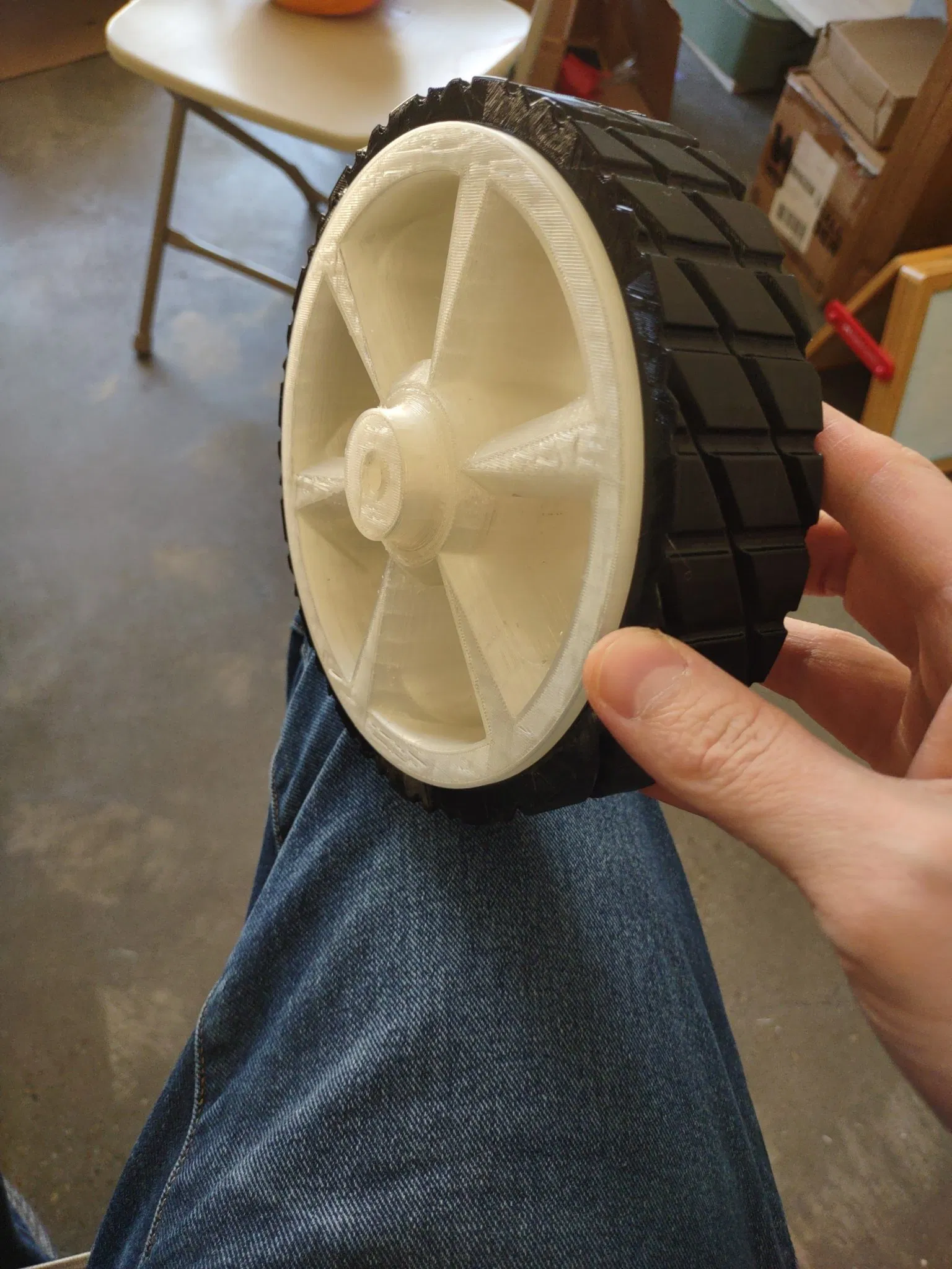 Nó có hai phần. Vành trong tôi in bằng PLA, và lốp ngoài được in bằng TPU. KHÔNG in cả hai phần riêng biệt bằng PLA. Chúng sẽ không thể ghép lại với nhau. Bạn nên có thể dễ dàng kết hợp hai phần lại với nhau nếu bạn chỉ muốn có một phần PLA (hoặc nhựa rắn khác). Nếu có cơ hội, tôi sẽ tải lên phiên bản một mảnh. Lốp TPU chỉ là một nỗ lực để tránh việc làm chip PLA khi bánh xe lăn. Chúng ta sẽ xem nó giữ được lâu dài như thế nào.
