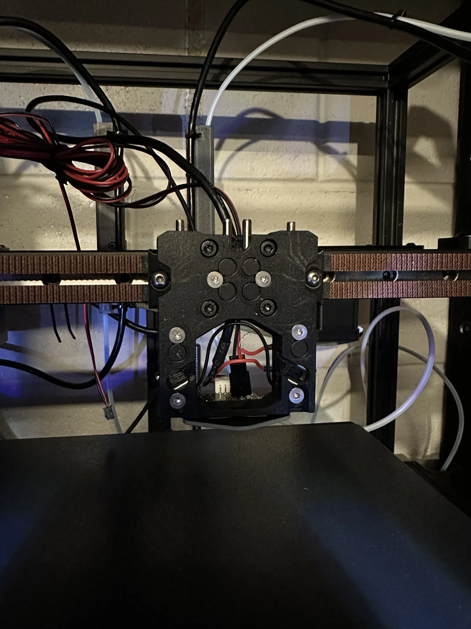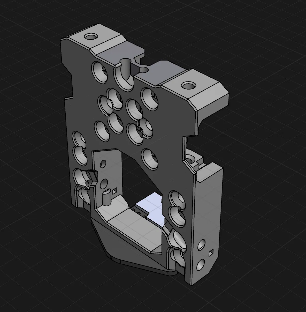 Phần carriage có 2 lỗ ở phía dưới để bắt vít cố định cảm biến cartographer hoặc beacon trực tiếp vào nhựa. Thiết kế cũng bao gồm một rãnh ở giữa để đi dây cáp cảm biến và dây x endstop (nếu bạn muốn) lên trên, giúp tránh việc đi dây rườm rà.