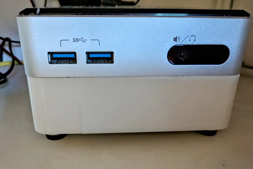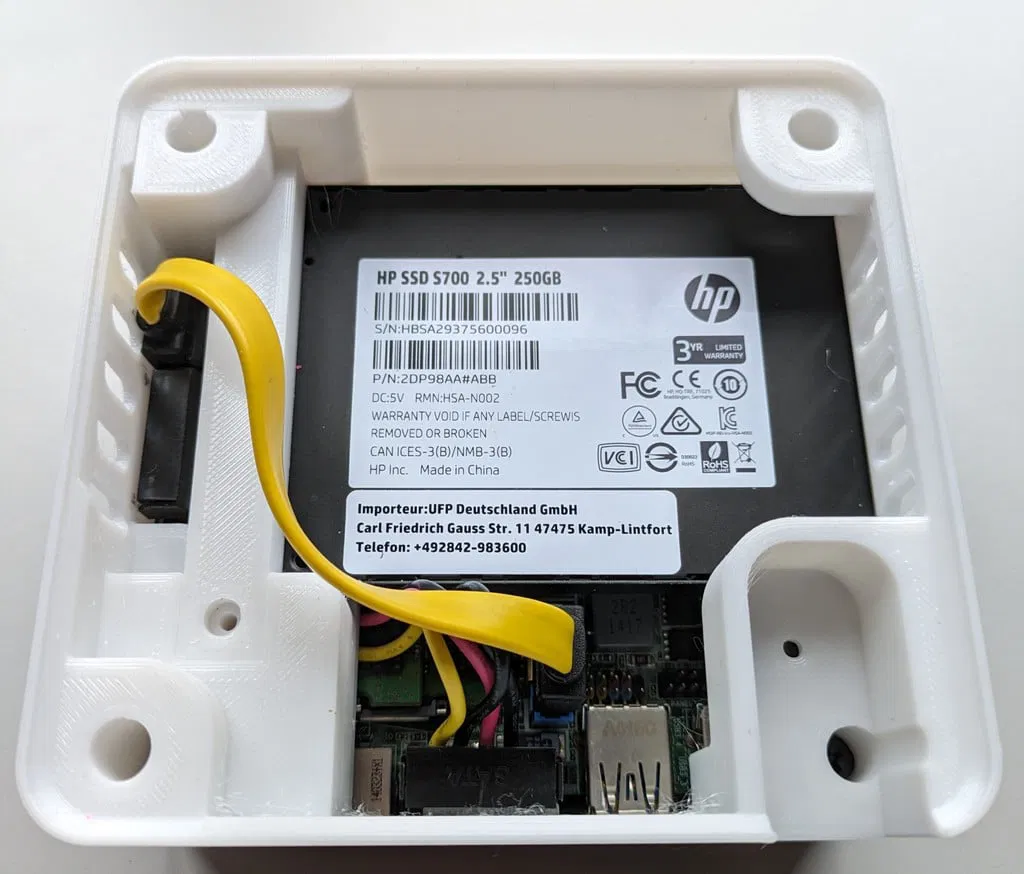 Cái vỏ (case) này giúp bạn lắp thêm ổ cứng SSD cho các dòng máy Intel NUC vốn không có đủ không gian chứa. Nó thay thế cho nắp đáy zin và dùng lại ốc vít cũ để cố định vào máy. Thiết kế này cho phép bạn chồng nhiều chiếc NUC lên nhau để tạo thành một 'tòa tháp' ổn định. Nếu xếp chồng, lỗ hổng ở mặt trước giúp bạn truy cập công tắc nguồn của NUC ở phía dưới. Bạn có thể dùng file "NUC_ON_OFF_HOLE_Filler.stl" để bịt lỗ này nếu không cần thiết, ví dụ như cho chiếc NUC ở đáy tháp. Để cố định SSD, hãy dùng "NUC_SSD_Fixation_Bar.stl". Nếu bạn không xếp chồng hoặc dành cho NUC ở dưới cùng, hãy in 4 cái "NUC_Leg.stl". Các chân đế này khớp vào 4 lỗ ở góc, cho phép bạn gắn lại miếng đệm cao su zin để NUC không bị trượt. Lưu ý: Hãy dùng cáp SATA và cáp nguồn đầu vuông cho SSD để vừa khít, do mình thiết kế theo kích thước chuẩn của NUC để đảm bảo tính thẩm mỹ. Mình in bằng nhựa PETG trắng, để support cho các góc nghiêng trên 85 độ. Riêng phần chân đế thì đừng để support để tránh làm hẹp khe gắn vòng cao su. Nếu thích mẫu này, hãy để lại đánh giá, hình ảnh sản phẩm và nếu muốn bạn có thể mời mình một ly bia qua Patreon nhé! ### Thông số in - Hãng máy: Creality - Máy: Ender 3 - Raft: Không - Support: Có - Độ phân giải: 0.2mm - Infill: 20% - Chất liệu: Jayo PETG trắng ### Sau khi in: Nếu làm đúng hướng dẫn về support, bạn chỉ cần gỡ một chút ở góc và lỗ vuông nơi gắn thanh cố định là xong.