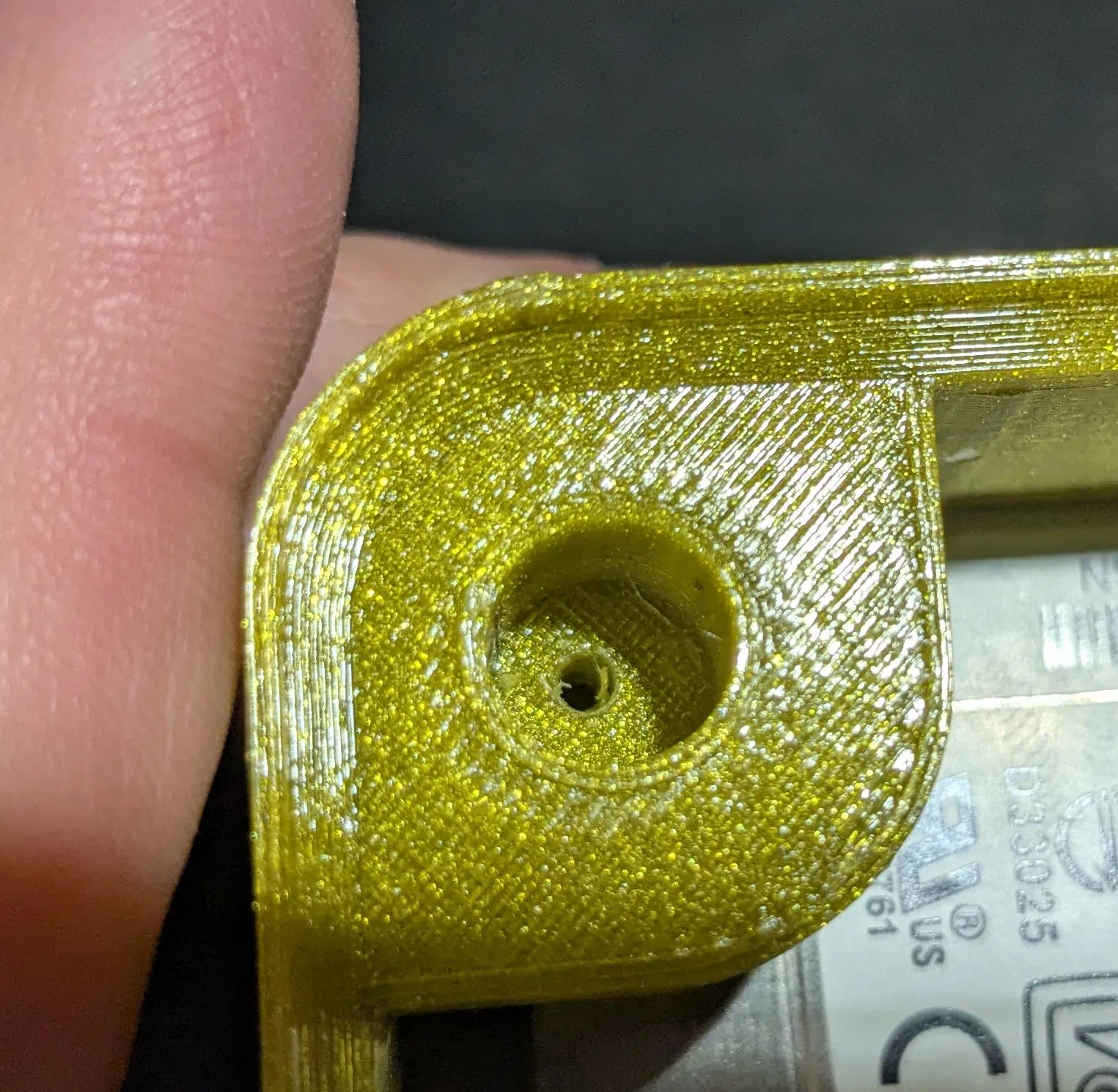 - Các lỗ bổ sung - để tránh hư hỏng thì làm bước này trước khi lắp - dùng mũi khoan 2mm tạo lỗ nhỏ trên phần nhựa đã in ở các góc đặc hoặc thêm các hình trụ negative volume để gắn hot inserts sau này