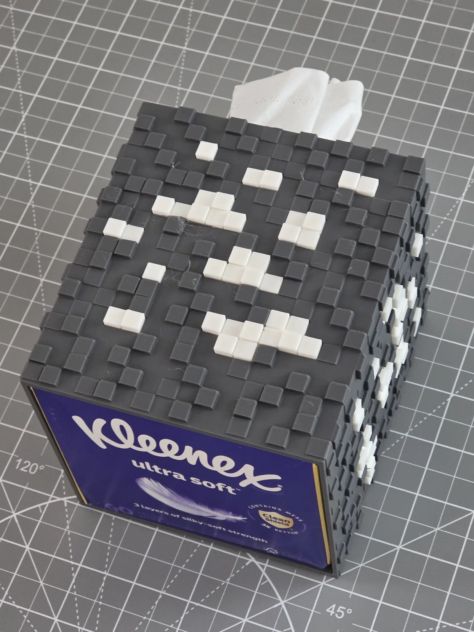 Lưu ý rằng độ dày của các vách tường không đều nhau do hộp khăn giấy Kleenex không vuông vắn hoàn hảo. Hai trong số các miếng chèn pixel màu trắng sẽ mỏng hơn hai miếng còn lại, hãy đảm bảo bạn lắp chúng vào đúng vị trí vách tương ứng. Khi đã lắp vào, các miếng này phải nằm phẳng so với mép bên trong.