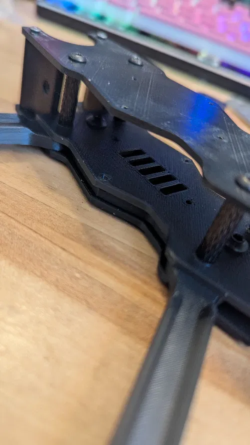 In bằng PLA vẫn ổn, nhưng mình khuyên dùng các loại vật liệu cứng cáp hơn pha sợi carbon như PET-CF17 hoặc tương đương. Khung in bằng PLA nặng khoảng 50 gram (chưa tính mạch, motor, v.v.).