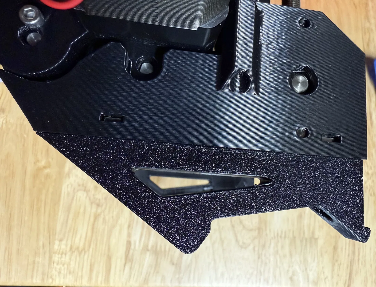 Mặc dù phiên bản rút gọn (lite version) của giá đỡ MMU3 hoạt động ổn, nhưng nó lại bắt buộc phải kẹp vào mép thanh ray kim loại phía trên. Thiết kế này khiến chúng ta không thể đậy tấm mica (acrylic panel) bên trên, làm ảnh hưởng đến nhiệt độ buồng in. Ngoài ra, mình cũng không ưng ý với góc độ của MMU sau khi lắp đặt, nên mình đã thiết kế lại phần giá đỡ này với góc nghiêng 35 độ so với phương ngang. Phụ kiện này hoàn toàn tương thích với bộ lọc khí của PRUSA và được cố định bằng hai ốc m3 bắt xuyên qua thanh ray phía sau. Mình khuyên các bạn nên dùng thêm vòng đệm (washers) cho ốc m3 vì MMU khá nặng, chỉ dùng hai ốc thôi thì hơi yếu.