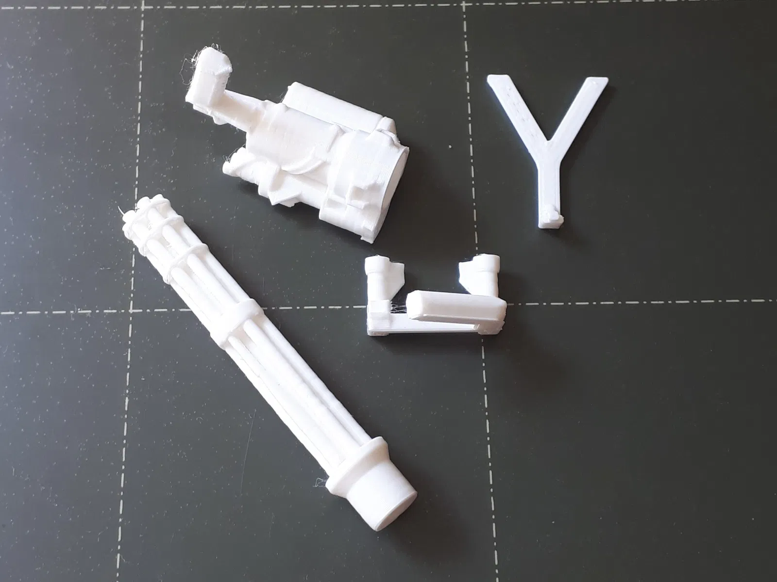 Bản All In One: Cẩn thận gỡ support, dán tay cầm và khung Y vào đúng vị trí, cuối cùng gắn nòng súng. Dùng file STL "do-not-print" làm tham chiếu. Tốt nhất là dùng keo 502.