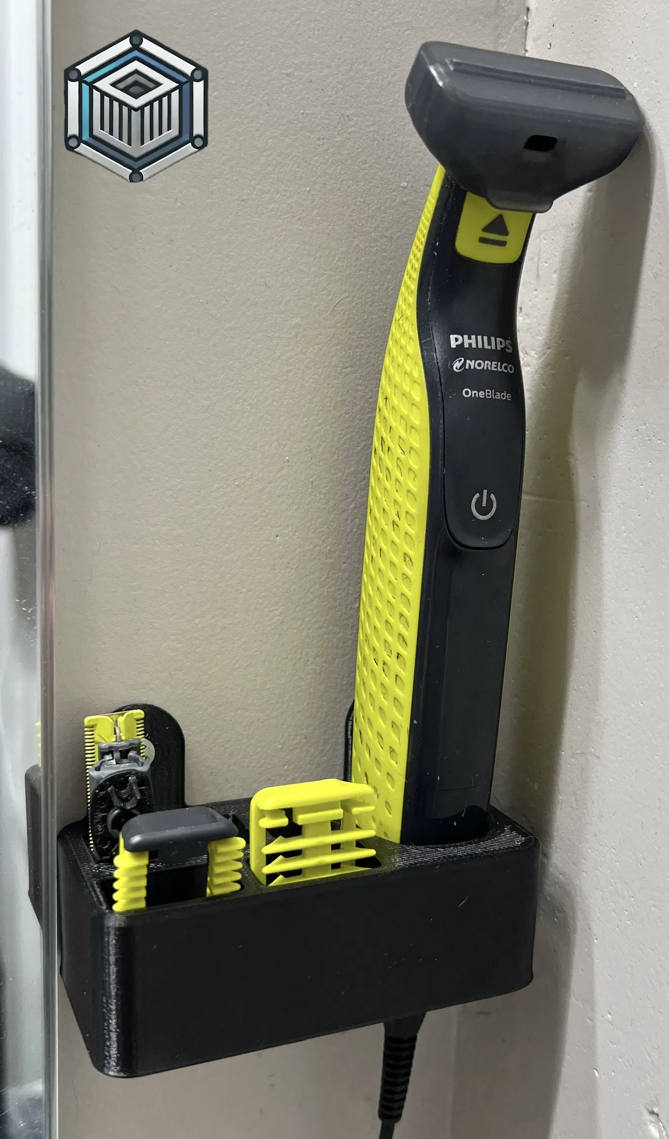 Giải pháp lưu trữ treo tường đơn giản cho máy cạo râu Philips Oneblade và phụ kiện. Thiết kế tối ưu, dễ in, giúp không gian phòng tắm gọn gàng và bảo quản lưỡi cạo an toàn hơn.