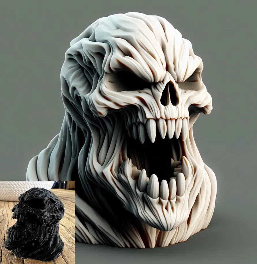 Một mẫu figurine 3D mới được tạo bằng AI, mô phỏng hình đầu lâu quái vật. Đừng quên nhấn LIKE, tải file về và đăng hình thành phẩm của bạn lên nhé, cảm ơn mọi người nhiều! Được hỗ trợ bởi công nghệ Image-to-3D từ MakerWorld (https://makerworld.com/makerlab/imageTo3d)