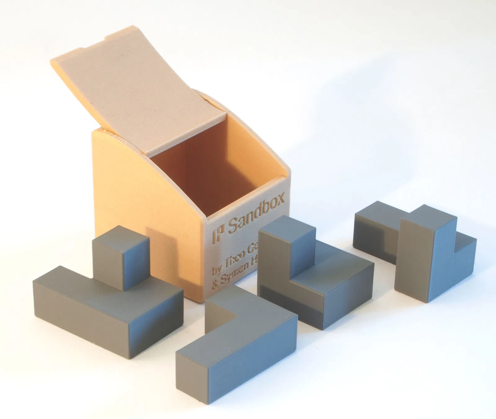 Khám phá Sandbox, một mẫu puzzle độc đáo từ bộ sưu tập No Problem Puzzles. Thử thách xếp bốn khối polycube vào hộp và đóng nắp thật khéo léo. Một dự án giải đố mã nguồn mở tuyệt vời dành cho những ai yêu thích in 3D và muốn rèn luyện trí tuệ.