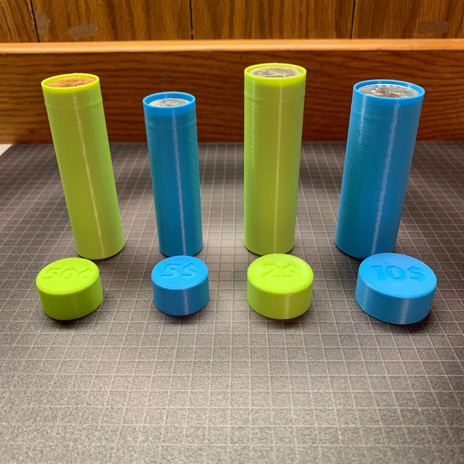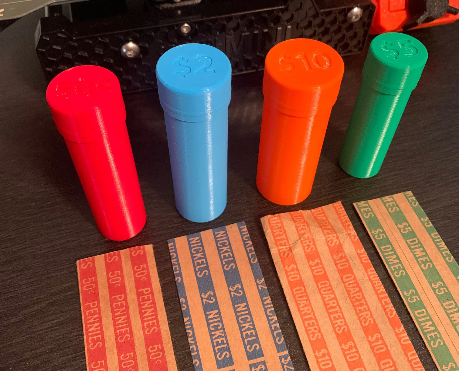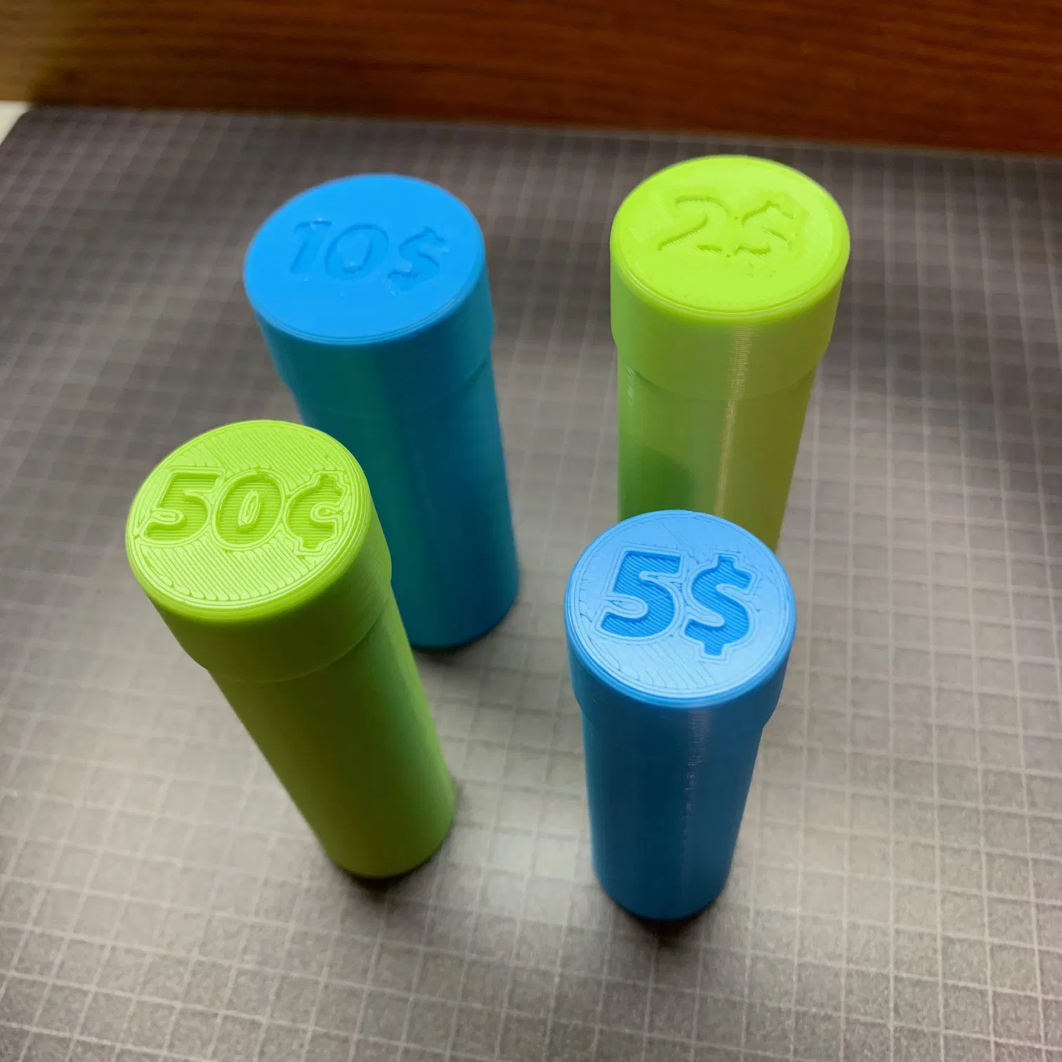 Đây là những ống đựng tiền xu Mỹ đơn giản giúp bạn sắp xếp đống tiền lẻ của mình gọn gàng. Bạn có thể dùng để đựng tiền xu loại pennies, nickels, dimes và quarters. Giá trị của đồng tiền được khắc ngay trên nắp. Mình thiết kế mẫu này muốn hướng đến sự đơn giản, không tốn quá nhiều nhựa và thời gian in. Độ dày thành ống là 0.8mm và độ hở (tolerance) giữa nắp và ống là 0.08mm. Có một cái gờ nhỏ cao 1.5mm để tạo khớp nối ma sát chắc chắn. Khớp này sẽ hơi chặt trong lần đầu sử dụng. Mình để thông số khít như vậy là để tránh việc nắp bị tuột ra do trọng lượng của tiền xu. Mỗi ống đều có dư ra khoảng 1mm chiều cao để chứa được cả những đồng xu có độ dày khác nhau. Các file STL, gcode và file 3mf với thiết lập mình đã sử dụng đều được bao gồm đầy đủ. Hãy đảm bảo máy in của bạn đã được cân chỉnh chuẩn và bạn đang sử dụng loại nhựa in có chất lượng tốt. Sử dụng đầu phun 0.4mm, profile layer height 0.2mm nhưng mình đã chỉnh lại layer height thành 0.3mm trong cài đặt in, 6 lớp mặt trên và dưới, vị trí đường seam để ở phía sau. Cập nhật: đã thêm phiên bản thứ hai với nắp ống mới. Hãy chia sẻ hình ảnh nếu bạn đã in nhé!