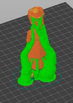 - Hỗ trợ (Support): Do mô hình có nhiều chi tiết chìa ra như phần mũ và tay cầm, anh em bắt buộc phải sử dụng cấu trúc hỗ trợ (như trong ảnh hướng dẫn) để đảm bảo các vùng nhô ra không bị lỗi, đặc biệt là quanh phần váy và tay.