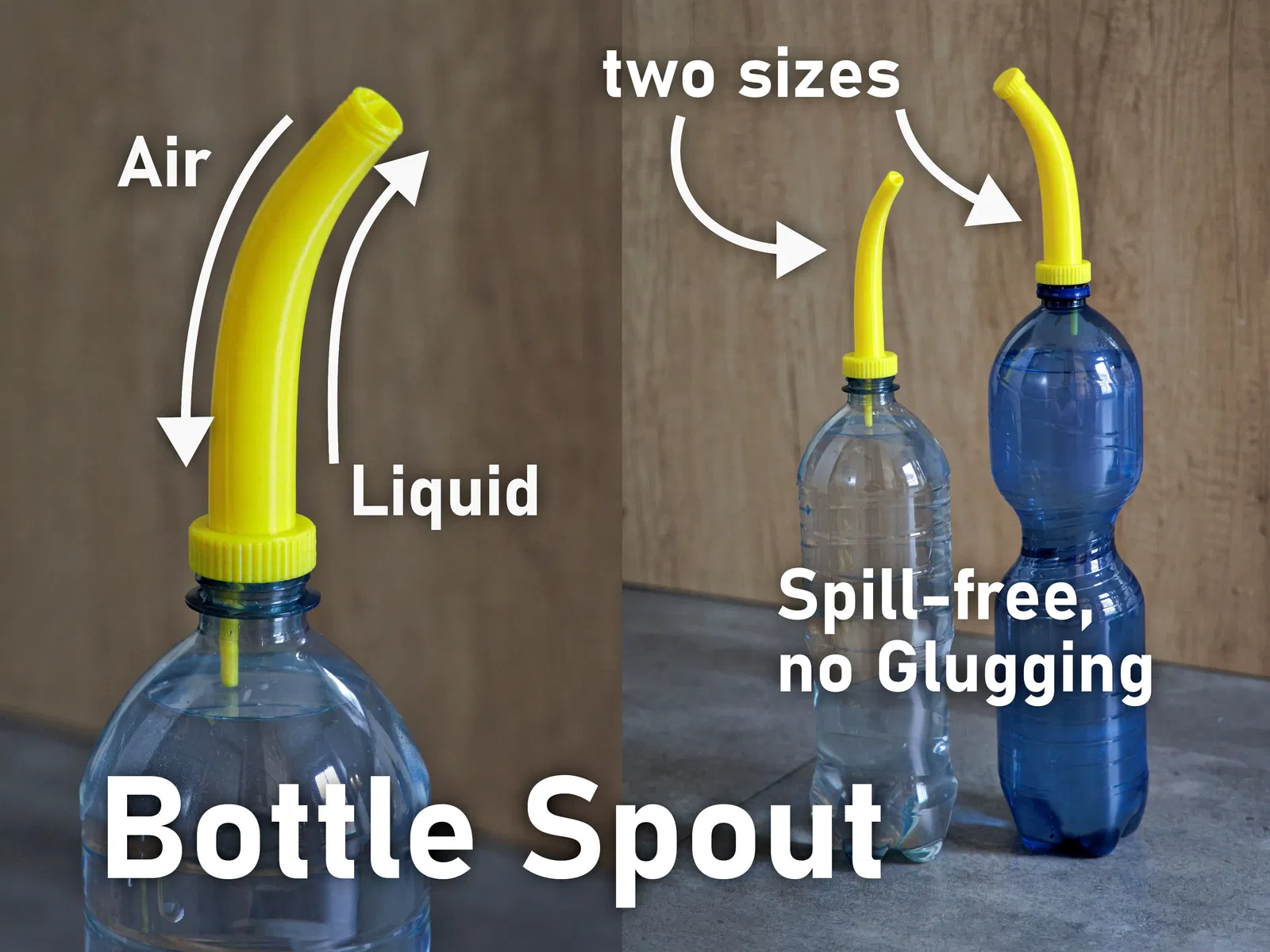 Đầu vòi rót nước tích hợp kênh dẫn khí giúp chất lỏng chảy mượt mà, không bị ọc ạch hay trào đổ. Thiết kế tương thích với chai PET/thủy tinh, dễ in 3D không cần support, đi kèm nắp đậy tiện lợi và hai phiên bản lưu lượng khác nhau.