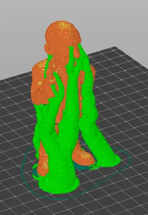 • Hỗ trợ (Support): Do tư thế nhân vật có các phần nhô ra như cánh tay cầm thiết bị, bạn nên cài đặt hỗ trợ (support) hợp lý trong phần mềm slicer như hình minh họa để tránh lỗi khi in các phần lơ lửng.