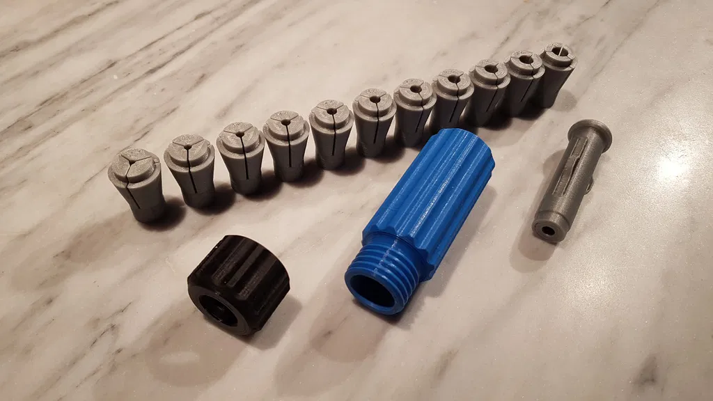Vì không phải lúc nào mình cũng muốn dùng máy khoan điện để chỉnh sửa lỗ khoan, nên mình đã tìm một dụng cụ cầm tay. Mình có tham khảo vài thiết kế trên Thingiverse nhưng các mẫu đó không hợp ý mình lắm vì trông hơi cồng kềnh. Một điểm yếu nữa là các đầu kẹp (collets) thường bị kẹt cứng sau khi vặn chặt.