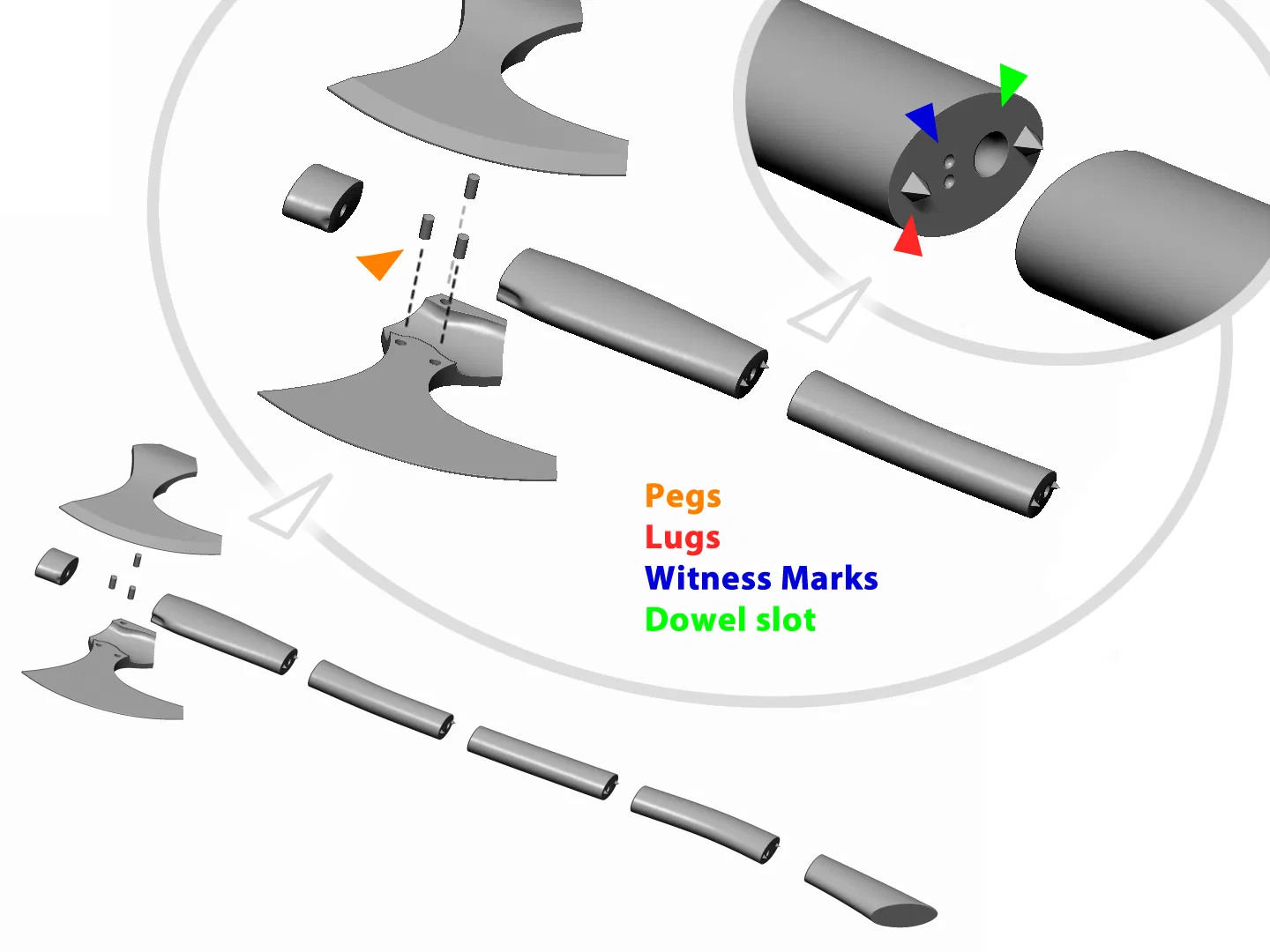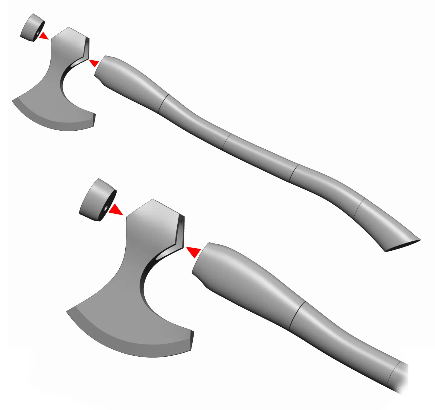 Thiết kế dạng module giúp in ấn dễ dàng hơn. Phần tay cầm có các chốt và khớp để căn chỉnh chính xác, nhưng bạn bắt buộc phải dùng keo. Ngoài ra còn có các chốt in sẵn để căn chỉnh đầu rìu, và một lỗ tròn bên trong thiết kế để bạn luồn thêm thanh gỗ hoặc thép đường kính 6mm / ¼ inch nhằm gia cố độ chắc chắn.