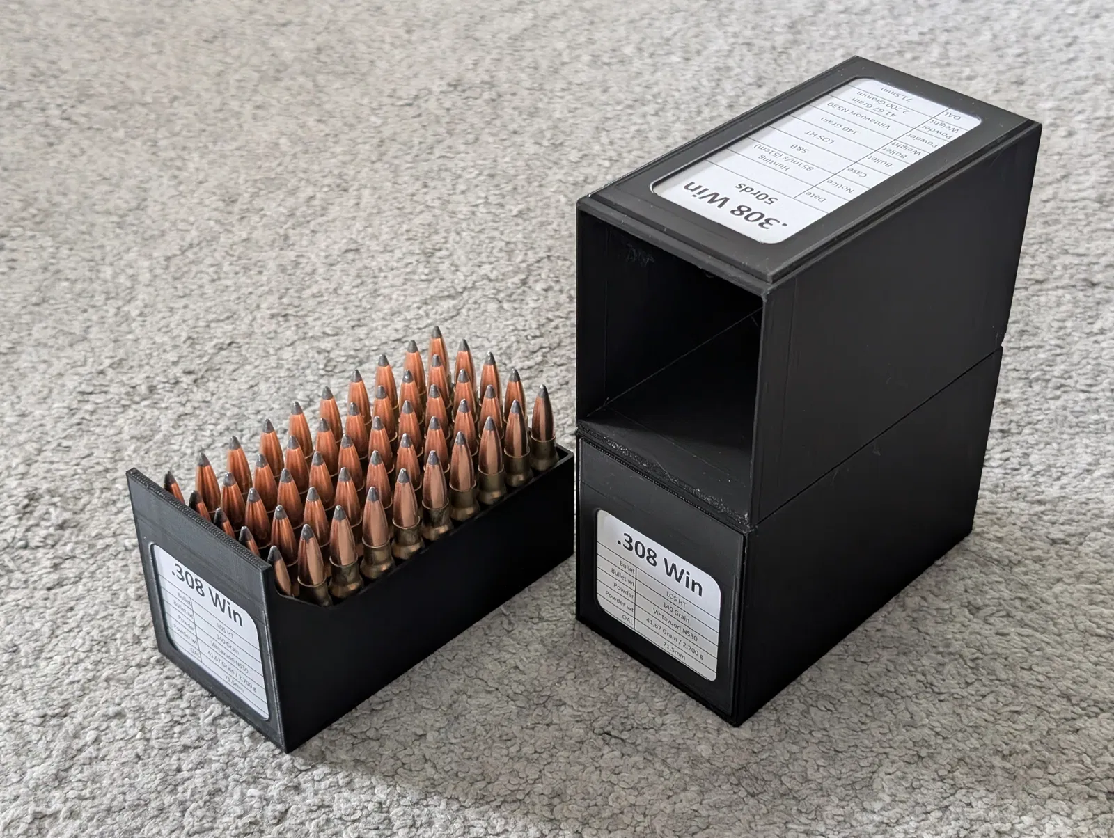 Hộp đựng đạn thiết kế siêu mỏng, nhỏ gọn dành cho cỡ đạn .308 / 7,62x51. Hộp có khả năng chồng tầng, tích hợp khe để nhãn ghi chú thông số bên trong mà không làm mất thẩm mỹ. Dễ dàng in ấn không cần support.