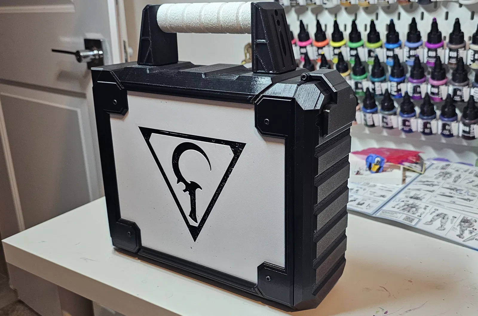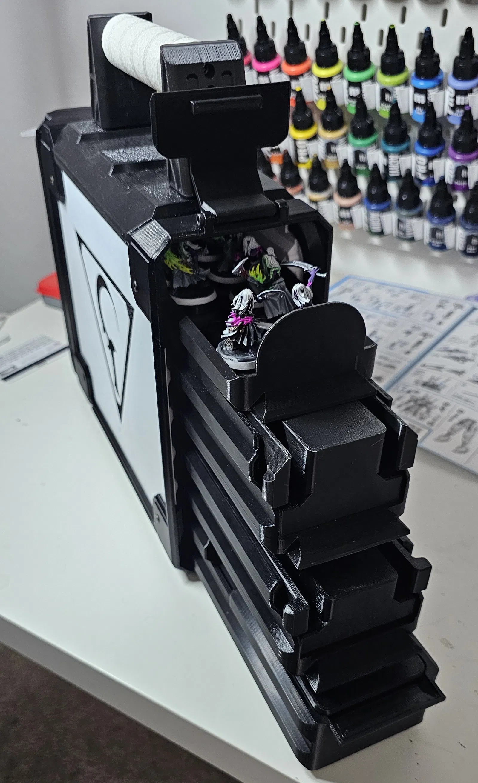 Tôi thiết kế BattleStack để có giải pháp vận chuyển tùy chỉnh cho đội quân Mandrakes trong Warhammer Kill Team của mình, sau đó mở rộng thêm dựa trên phản hồi của bạn bè về nhu cầu cá nhân cho các game khác. Các tệp panel bên hông và phía sau được để trống để bạn có thể tự thiết kế logo hoặc họa tiết theo ý thích.