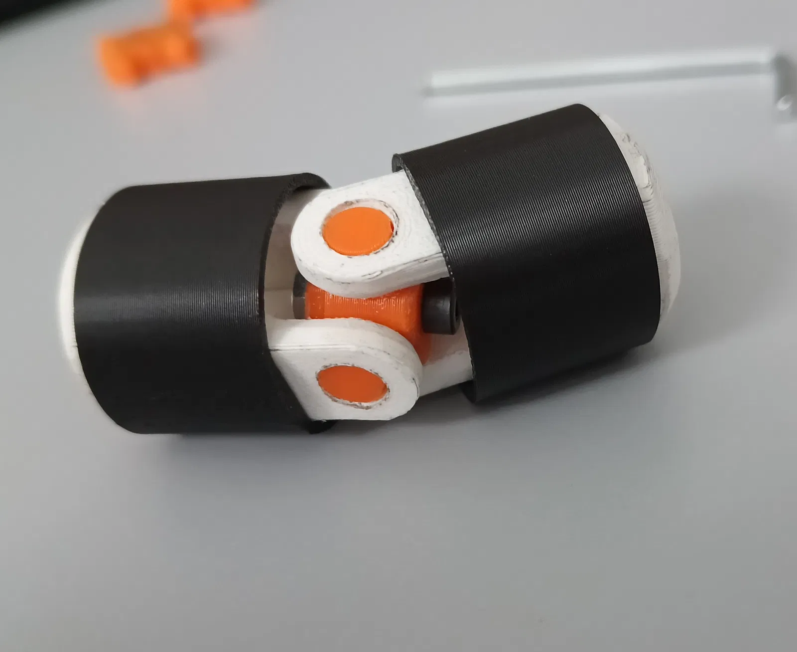 Chào mọi người, mình đã tự thiết kế mẫu khớp nối Cardan (Kardan) này trong lúc đang thực hiện dự án mô hình RC cho một chiếc xe công trình hạng nặng. Nó đã được đưa vào sử dụng ngay từ khi mình lắp hệ thống truyền động. Chúng mình đã thử nghiệm bằng cách dùng nó để kéo một người bạn nặng 105kg ngồi trên xe lăn. Tổng trọng lượng của mô hình là 16kg để đảm bảo bánh xe không bị trượt (tất cả mọi chi tiết, trừ trục và vòng bi, đều được in 3D). Kết quả thực sự gây bất ngờ cho cả nhóm, toàn bộ bánh răng và khớp Cardan vẫn hoạt động tốt mà không hề bị hư hại gì. Đây chính là mẫu khớp Cardan mà chúng mình đã dùng. Nó được in thành từng phần riêng biệt để lắp ráp dễ dàng hơn cũng như giúp tăng độ bền. Bạn có thể in bao nhiêu đoạn tùy thích để tạo thành một chuỗi khớp nối dài như con rắn vậy. Độ linh hoạt của nó rất tốt và các phần được cố định bằng vòng ngoài (như trong ảnh).
