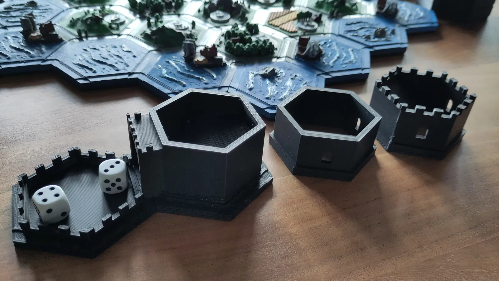 Nếu bạn muốn sử dụng thêm khay hứng xúc xắc, mình khuyên nên in kèm phần đế của bộ Catan-Brettspiel 2.0 rồi dùng nam châm để kết nối chúng lại với nhau: https://www.thingiverse.com/thing:2525182