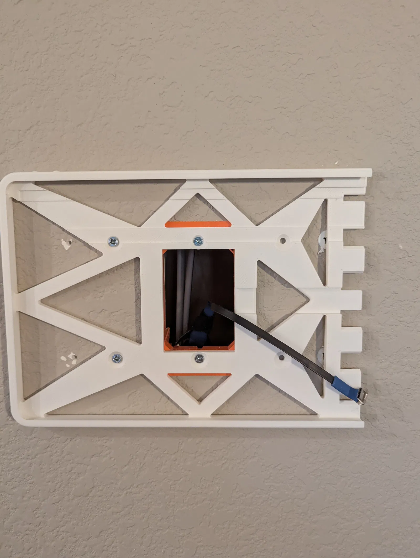Mình đã đi dây mạng POE Cat-5 ra phía sau bức tường nơi đặt tablet. Sau đó dùng bát gắn âm tường Calon Low Voltage để gắn tablet lên tường, đồng thời tạo không gian chứa bộ chuyển đổi POE sang USB.