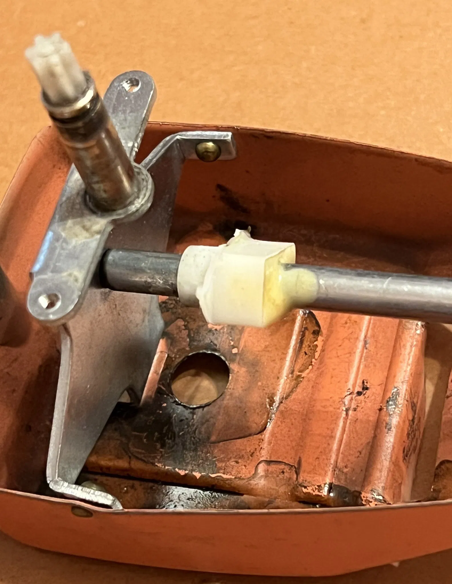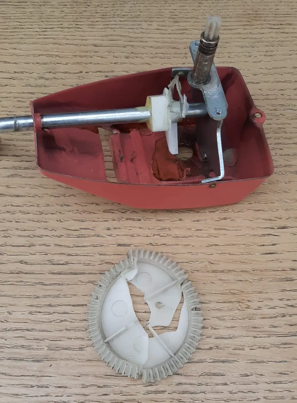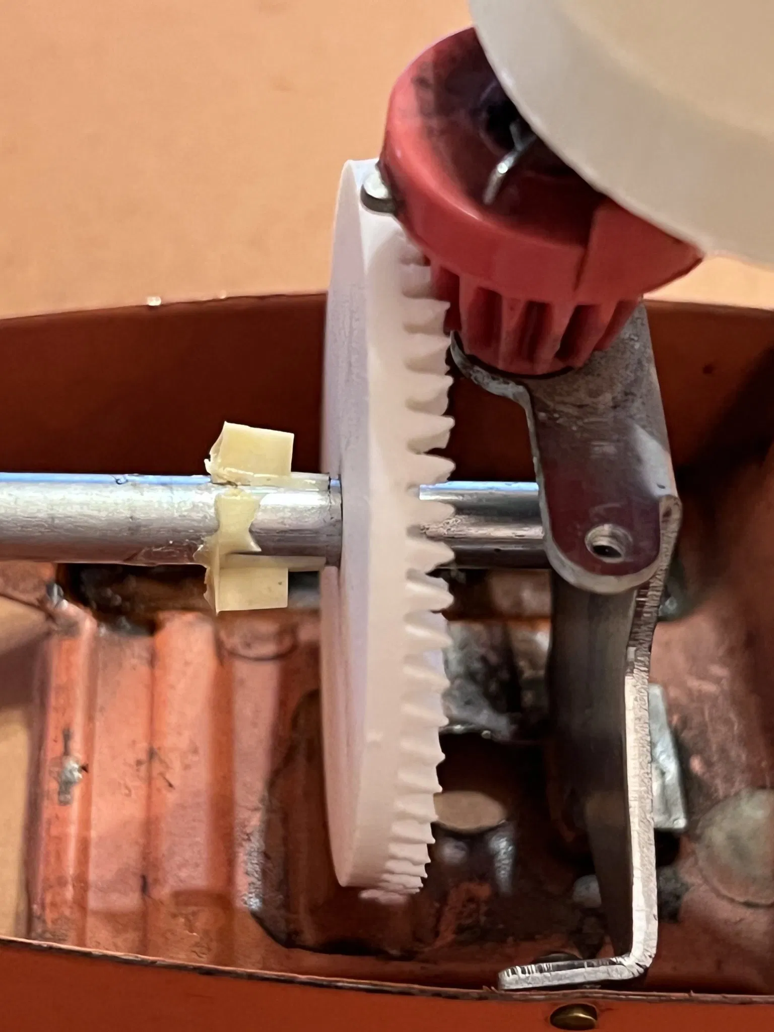 Bánh răng gốc được gắn chặt vào trục tay quay, qua một phần 'chìa khóa' phù hợp với rãnh chìa khóa. Những phần còn lại của bánh răng cũ và keo sẽ cần được loại bỏ, nhưng cần cẩn thận không làm hỏng phần chìa khóa. Tôi đã sử dụng kìm để nghiền nát phần còn lại của bánh răng cũ và keo ra khỏi trục, mà không nhận ra có một phần 'chìa khóa' riêng biệt bên dưới - do đó có dấu hiệu hư hại trong bức ảnh cuối cùng (cho thấy một phiên bản trước của bánh răng, được làm trước khi tôi biết về phần 'chìa khóa' này) - nhưng tôi đã để lại đủ phần chìa khóa để phù hợp với boss STL.