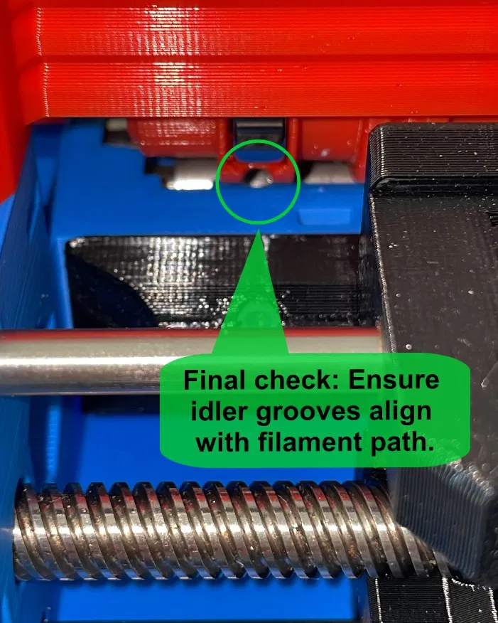 - Khi lắp idler vào idler body, hãy đảm bảo các gờ trên idler nằm chính giữa các rãnh trên idler body trước khi siết ốc lục giác coupler (bước 18 trong hướng dẫn của Prusa).