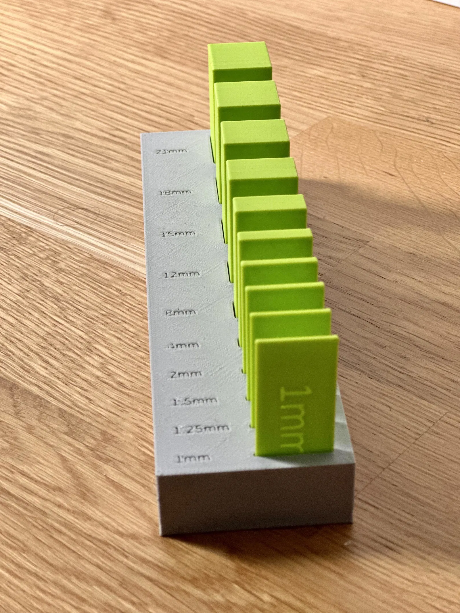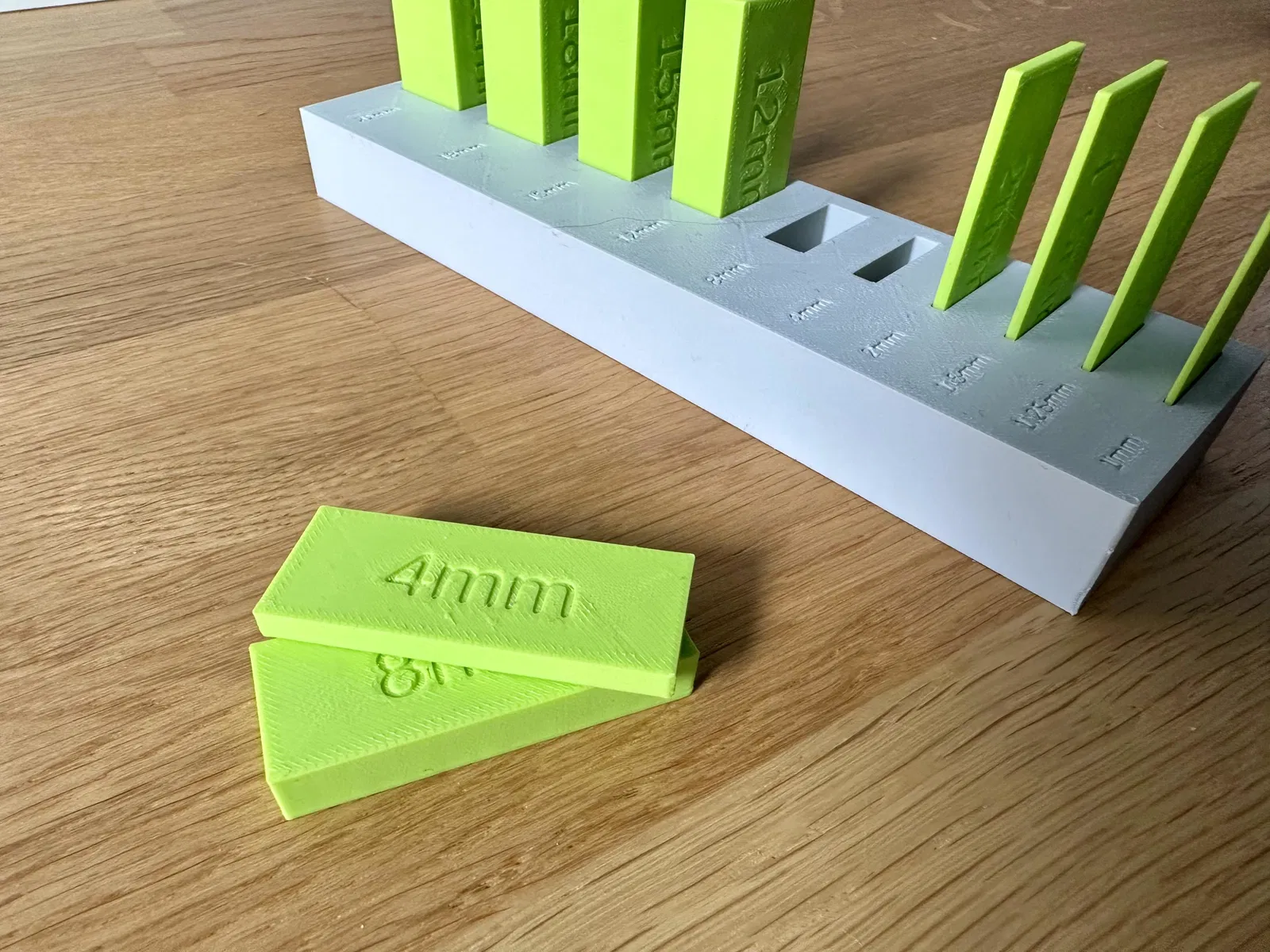 Các thước này ban đầu được thử nghiệm bằng nhựa PLA, nhưng để sử dụng lâu dài hoặc trong môi trường đòi hỏi cao hơn, bạn nên dùng loại nhựa bền hơn như PETG hoặc ABS. Để bù đắp dung sai máy in, bạn có thể in thước dư ra một chút (khoảng 0,1–0,2 mm). Sau khi in, dùng giấy nhám mịn chà nhẹ để bề mặt các mảnh được phẳng và đồng đều hơn.