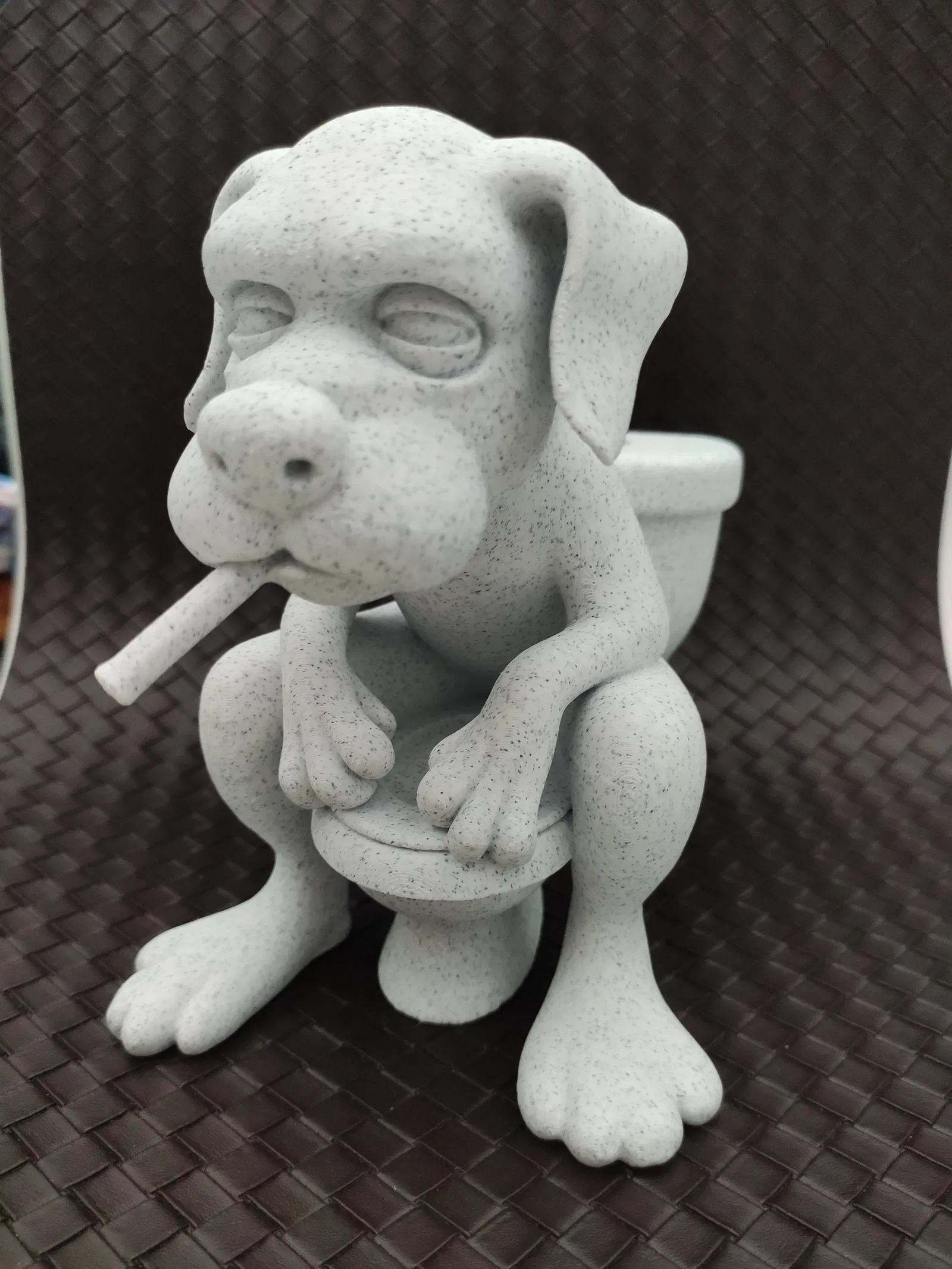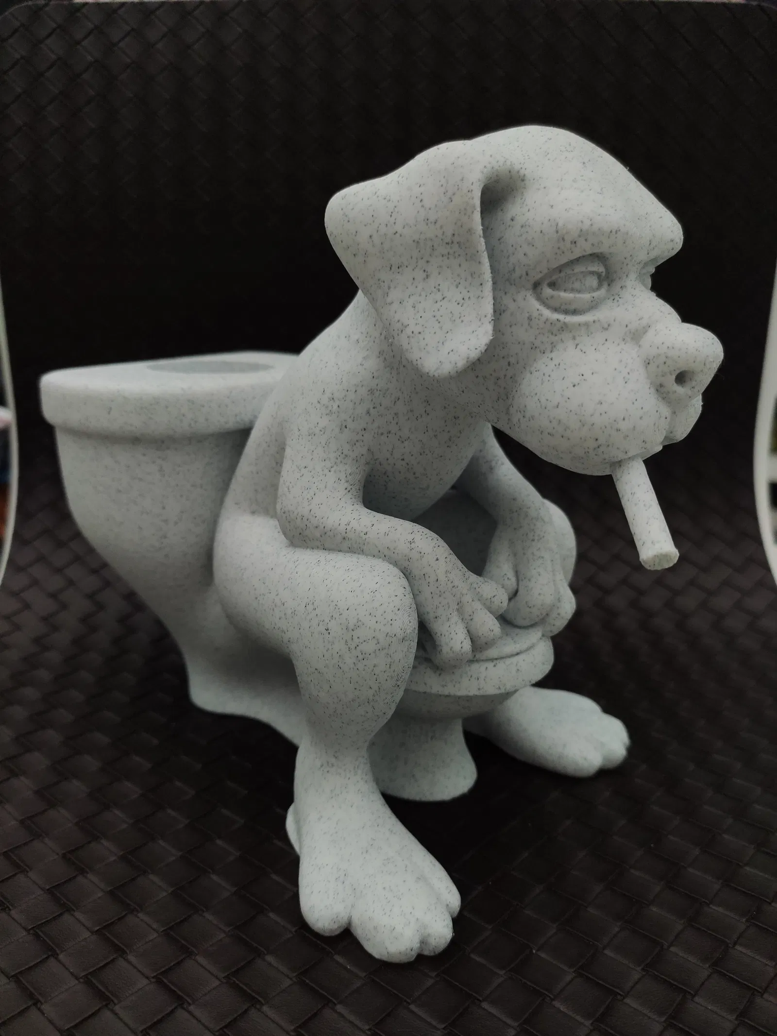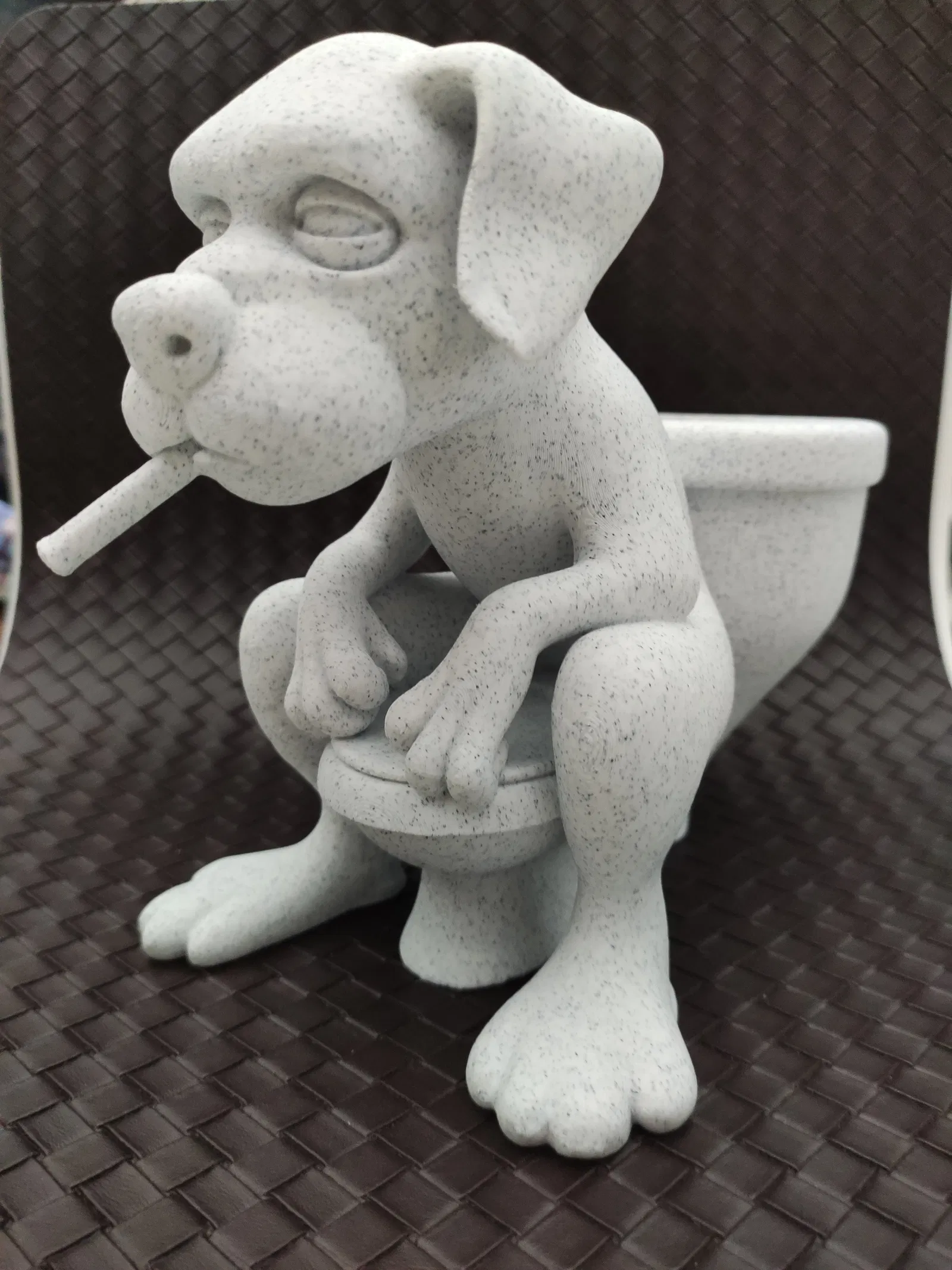 Mô hình 3D này khắc họa hình ảnh một chú cún đang trải qua một buổi sáng vô cùng mệt mỏi, ngồi trên bồn cầu với điếu thuốc trên miệng, đang tự vấn bản thân về những quyết định trong đời.