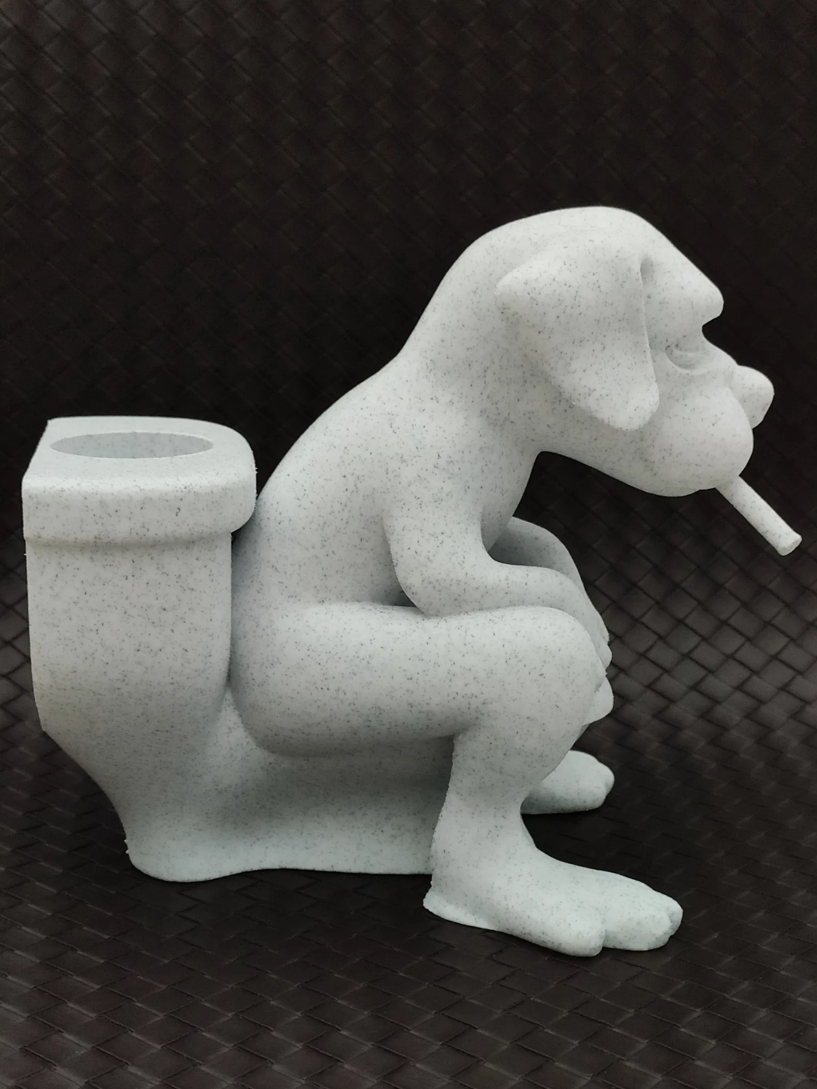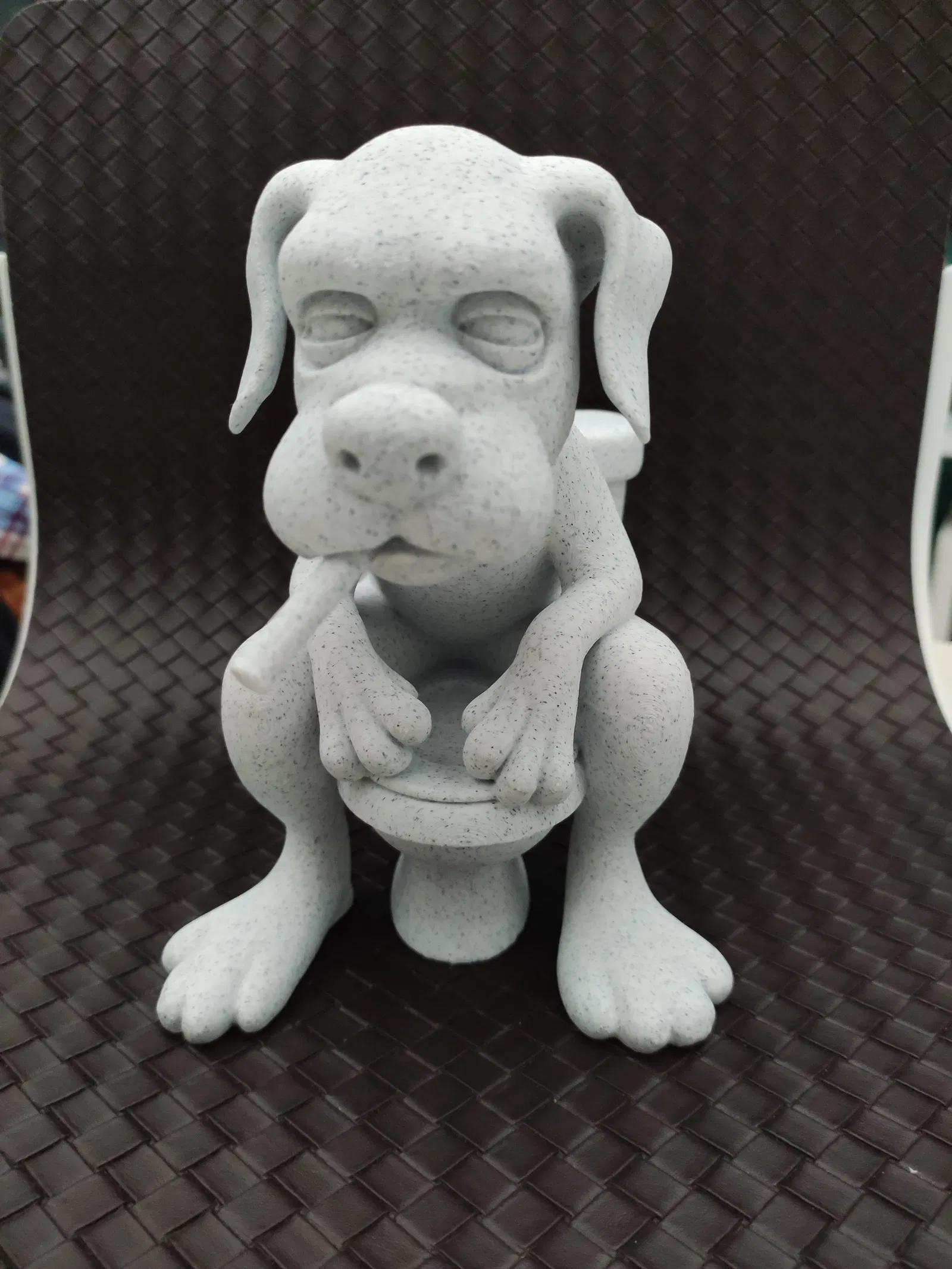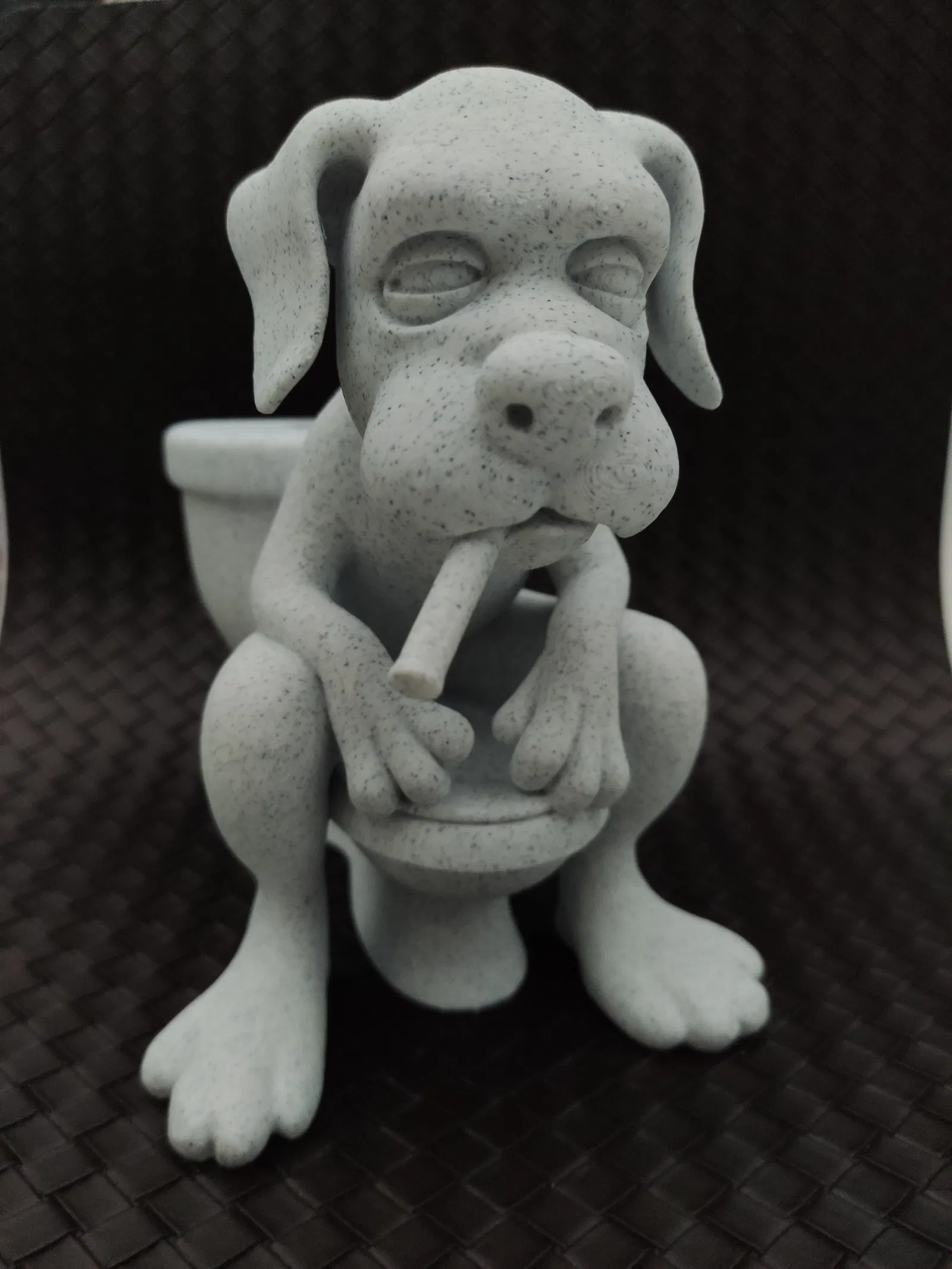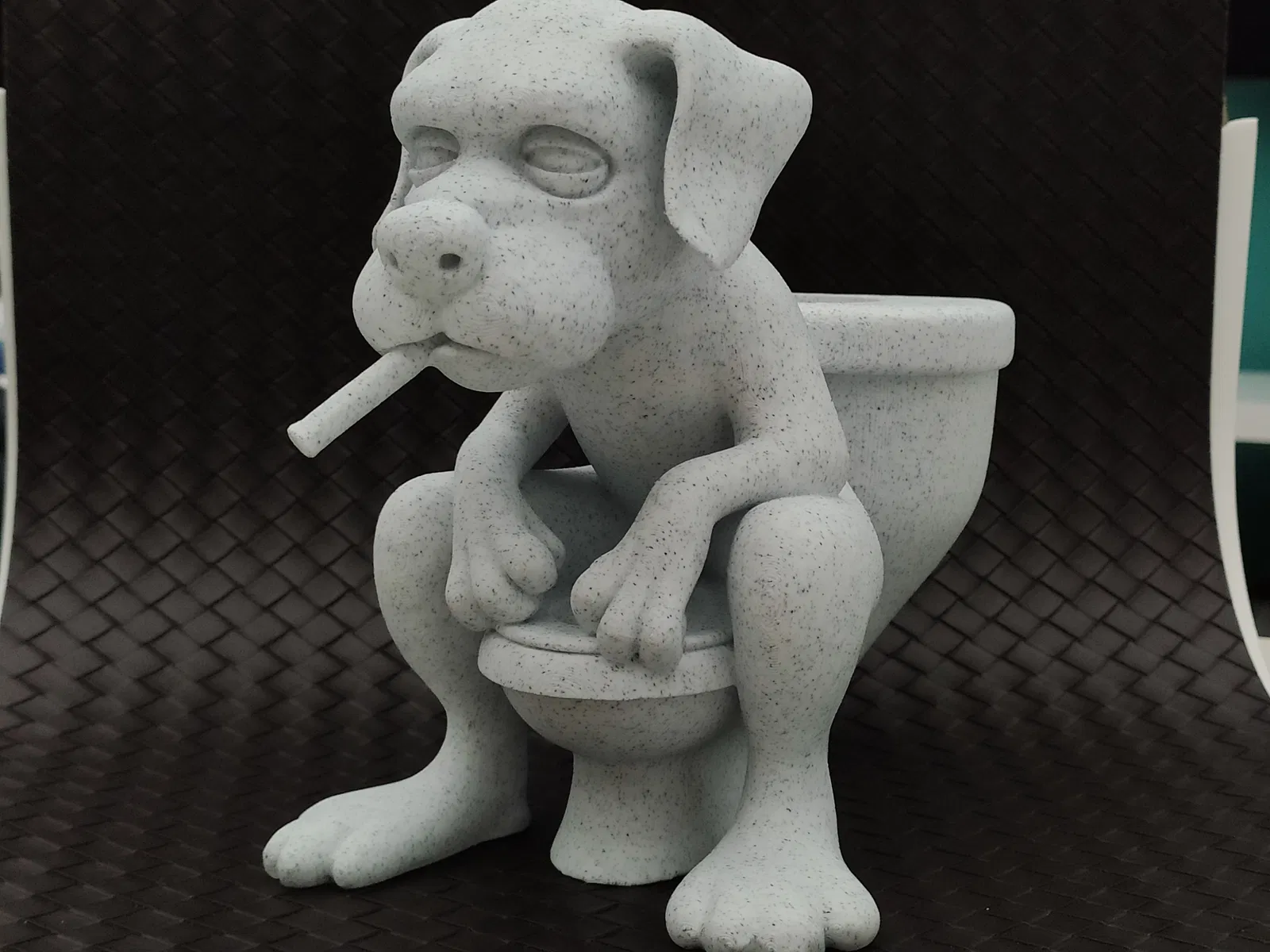 Mô hình 3D này khắc họa hình ảnh một chú cún đang trải qua một buổi sáng vô cùng mệt mỏi, ngồi trên bồn cầu với điếu thuốc trên miệng, đang tự vấn bản thân về những quyết định trong đời.