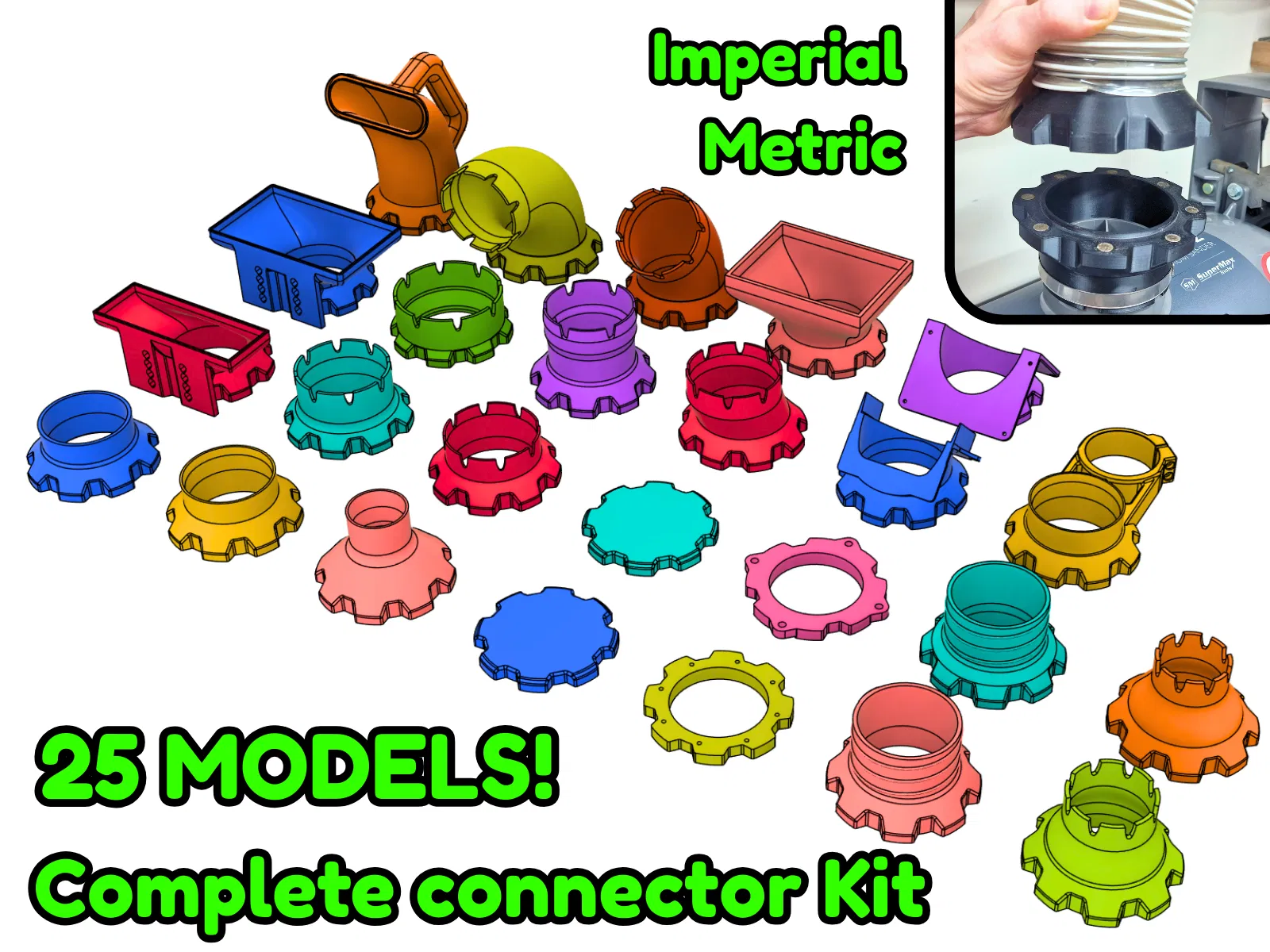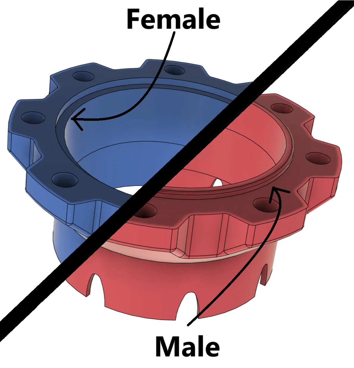 Các đầu kết nối có thiết kế gờ (đực) hoặc rãnh (cái) để đảm bảo chúng không bị trượt ra ngoài. Điều này có nghĩa là HƯỚNG LẮP ĐẶT LÀ RẤT QUAN TRỌNG!!! Mình thiết kế bộ này sao cho máy móc luôn gắn đầu ĐỰC (MALE) và ống hút sẽ gắn đầu CÁI (FEMALE). Để nối dài các đoạn ống với nhau, mình cũng đã làm thêm phiên bản 100mm lòng trong (cái) và 100mm lòng ngoài (đực) để nối ống với đường ống dẫn bụi chính. Đừng để nhầm lẫn giữa các loại này nhé!!!