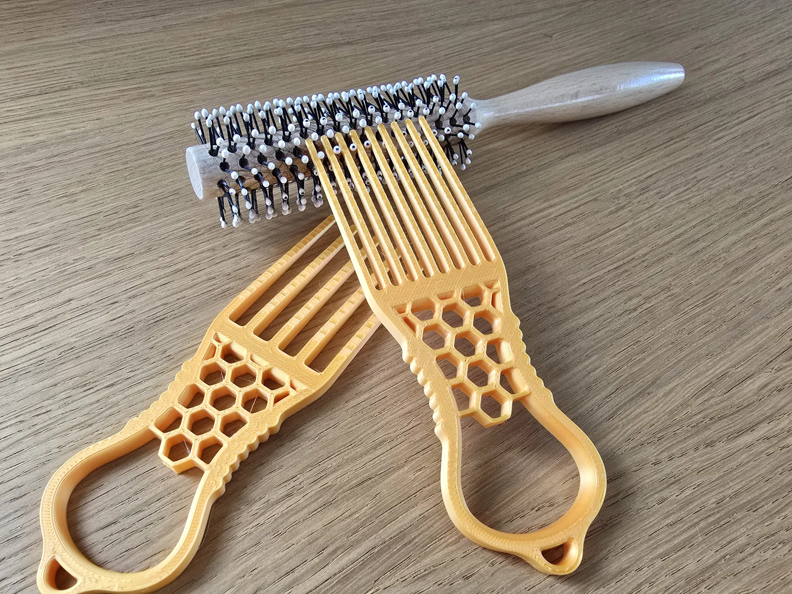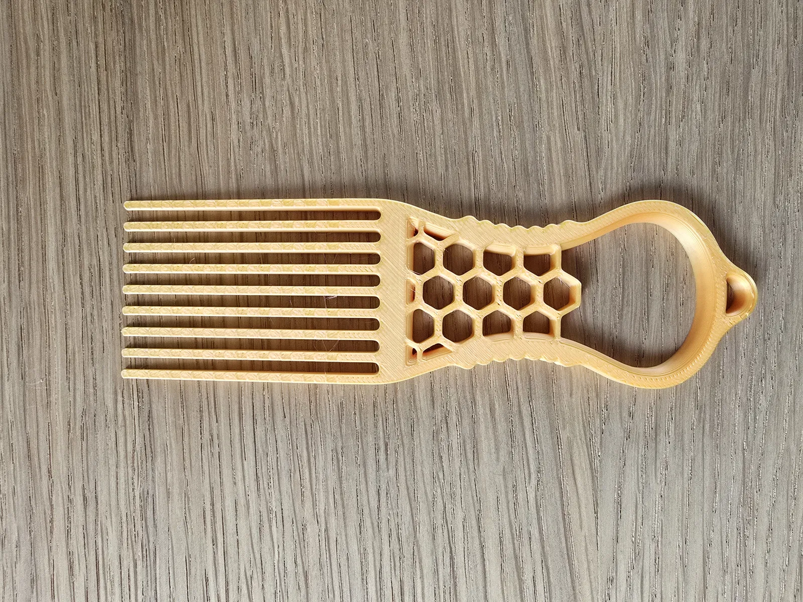 Sản phẩm có thiết kế thông minh với phần tay cầm được khoét lỗ theo họa tiết tổ ong độc đáo, không chỉ giúp giảm trọng lượng của vật in mà còn tạo cảm giác cầm nắm chắc chắn, không bị trơn tuột khi thao tác. Nhờ vào kích thước nhỏ gọn và phần đầu có lỗ treo, bạn có thể dễ dàng cất giữ dụng cụ này ngay trong phòng tắm hoặc treo chung với bộ dụng cụ làm đẹp của mình. Dù bạn sử dụng lược tròn, lược dẹt hay bất kỳ loại lược thông dụng nào, dụng cụ này đều có thể đáp ứng tốt nhu cầu làm sạch, giúp chiếc lược của bạn luôn như mới và đảm bảo vệ sinh da đầu tốt nhất.