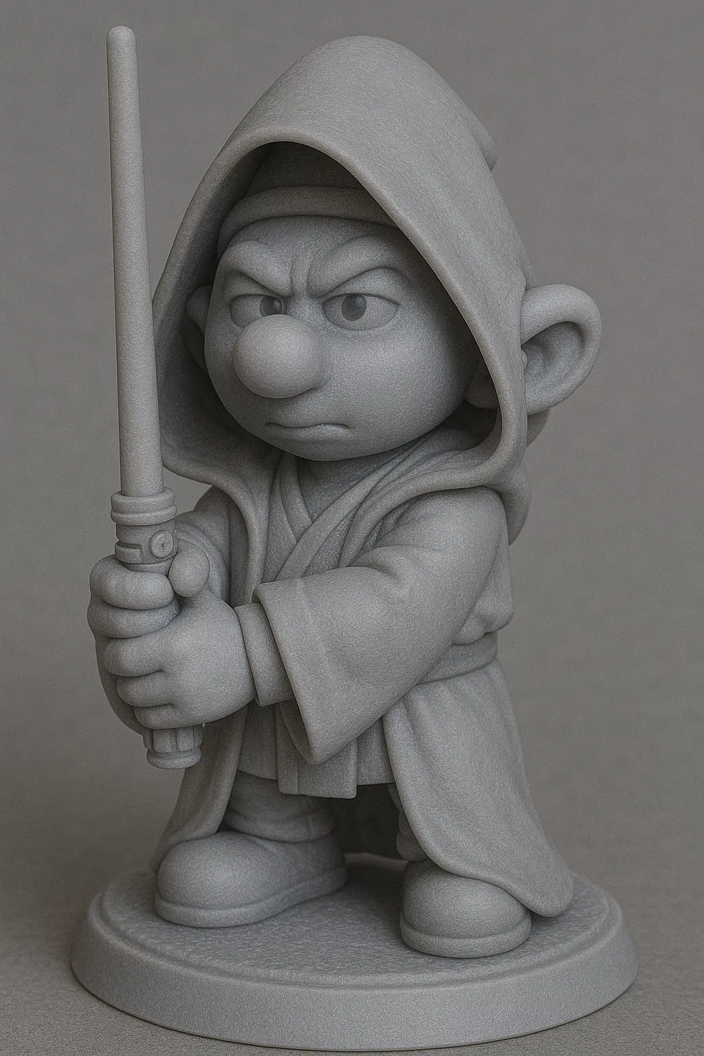 Một chú Xì Trum Jedi với vẻ mặt nghiêm nghị, khoác trên mình chiếc áo choàng và tay cầm thanh kiếm ánh sáng. Đây là lựa chọn tuyệt vời dành cho những ai là fan của Star Wars và yêu thích các mô hình thu nhỏ. Bạn có thể in mẫu này bằng nhựa PLA để thấy rõ các chi tiết tinh xảo như nếp gấp trên áo choàng và các đường nét trên chuôi kiếm.