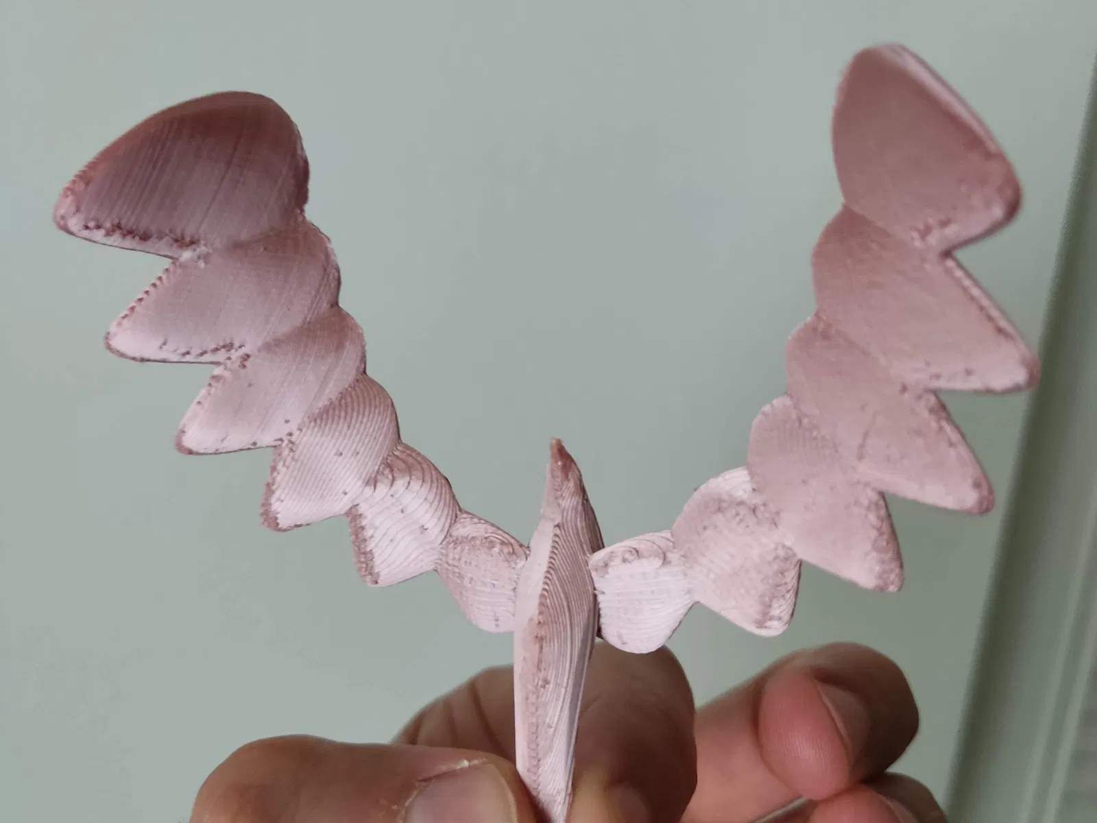 Hình ảnh cho thấy bản in PLA lụa màu vàng hồng ở 50%, nằm ngửa, sử dụng giá đỡ dạng cây, và hoàn thiện bằng một mỏ hàn để làm mịn bản in.