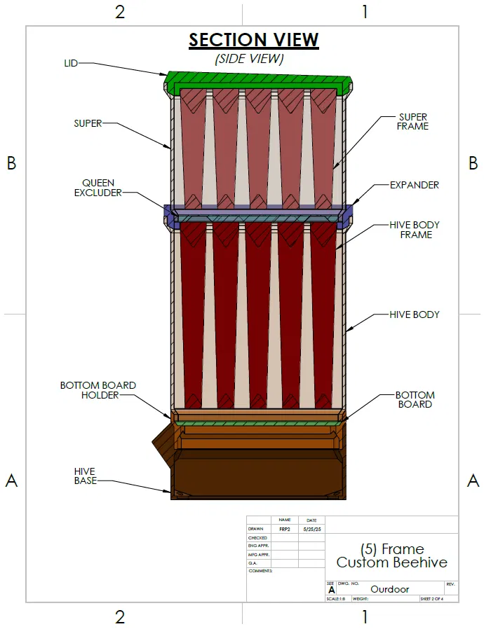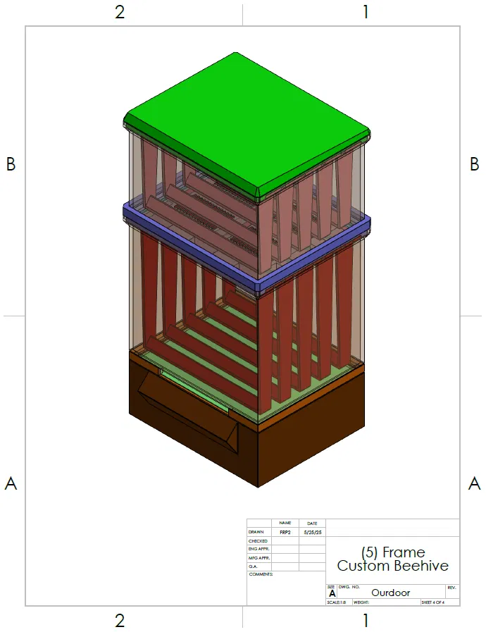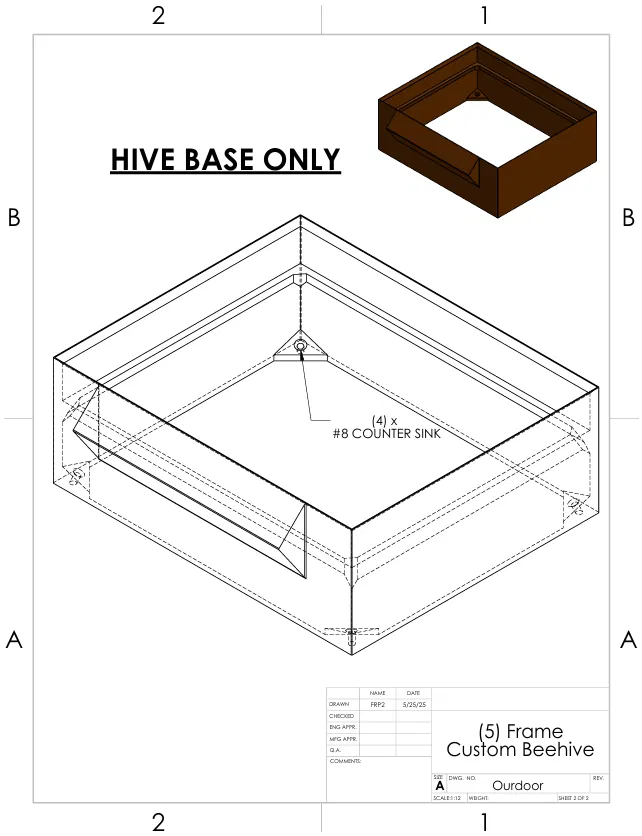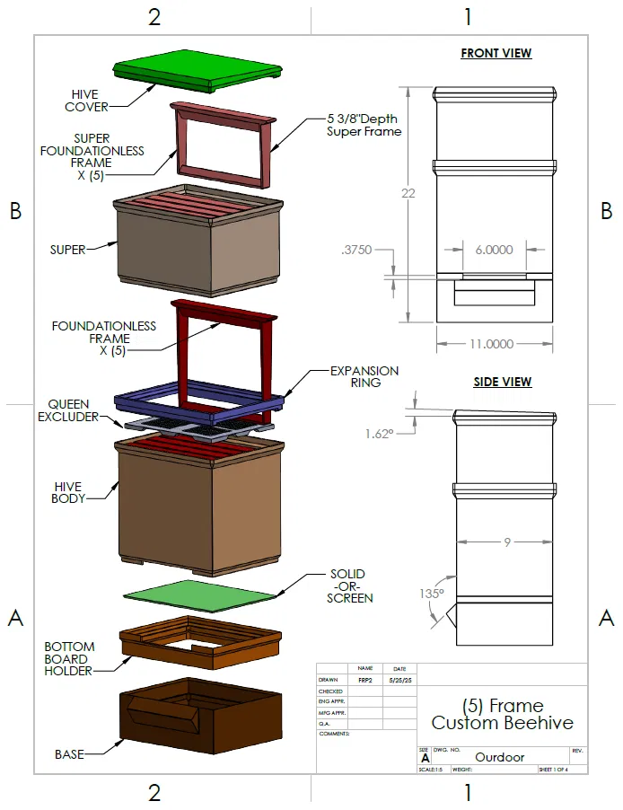 6/21/25: Đã tải lên tấm ngăn ong chúa (Queen Excluder) sẵn sàng để thử nghiệm. Xem bản vẽ, kích thước khe 4.25mmx8mm. Tấm ngăn này không bắt buộc nhưng một số người thích sử dụng trong quy trình của họ. Ngoài ra, đã thêm đế thùng (Hive Base) có thể bắt vít xuống bề mặt bên dưới.
