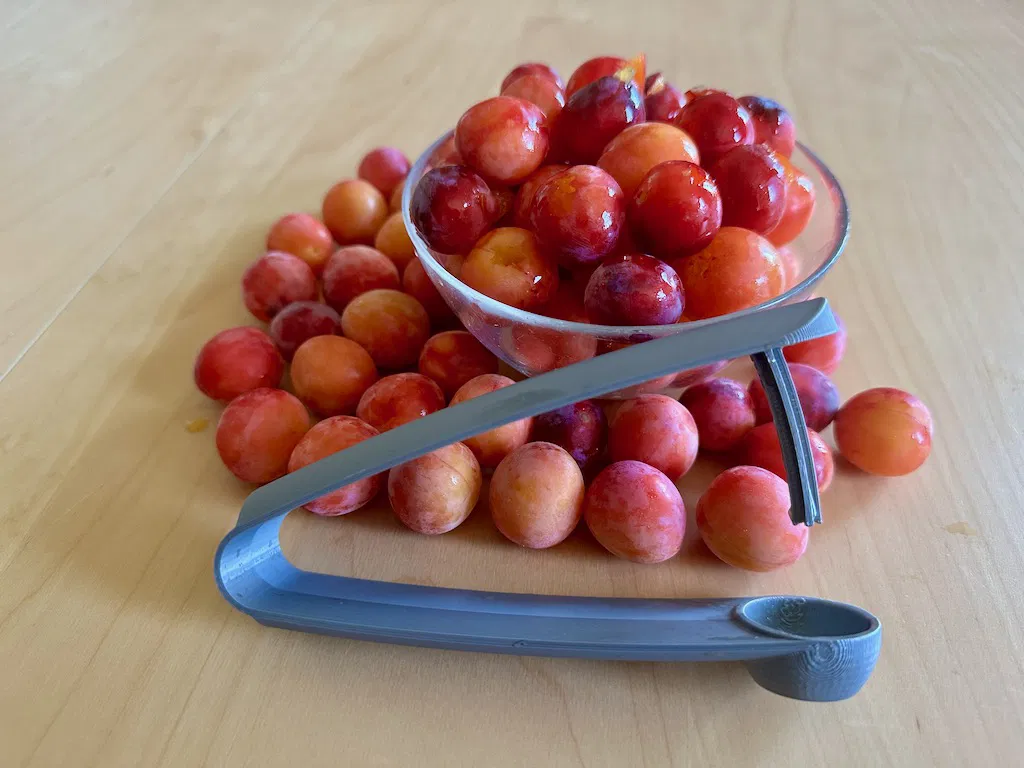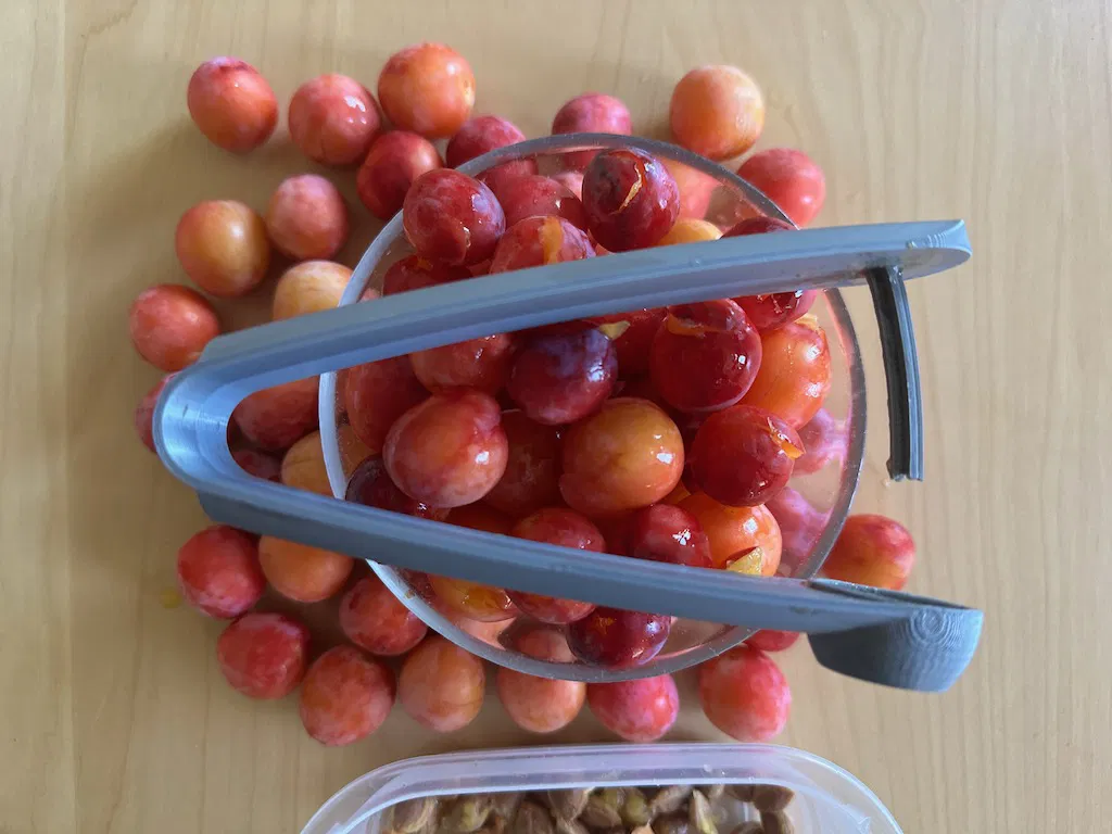 Cập nhật cho quả mận mirabelle đây! 😉 Sau khi dùng thử với hàng ký anh đào và anh đào chua, cái dụng cụ lấy hạt này đã được kiểm chứng là dùng tốt cả với mận mirabelle! Loại trái cây bị đánh giá thấp này có mùi thơm và hương vị tuyệt vời, rất ngon và thích hợp để làm mứt hoặc nướng bánh 😋. Dụng cụ lấy hạt anh đào và mận mirabelle này loại bỏ hạt rất hiệu quả và dễ dàng vệ sinh. Nó được in nguyên khối, không cần thêm linh kiện nào khác. Hãy in bằng nhựa PLA hoặc PETG, chiều cao lớp 0.2, độ đặc 30% và có hỗ trợ (support).