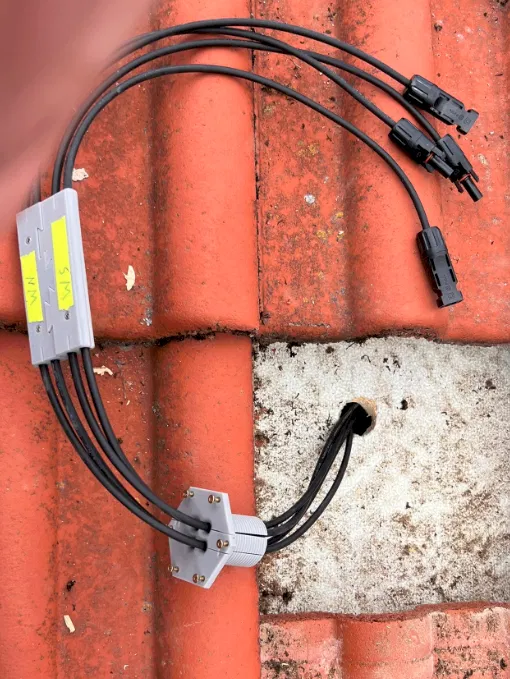 Mình có mua hệ thống điện mặt trời của hãng Kleines Kraftwerk. Hệ thống gồm 4 tấm pin năng lượng mặt trời, mình lắp theo cặp trên mái nhà hướng Đông và Tây. Để dẫn dây cáp từ mái vào gác mái một cách gọn gàng, có tổ chức (không bị lẫn lộn, được gom lại và kẹp chặt) và bảo vệ tốt, mình đã thiết kế bộ sản phẩm này.