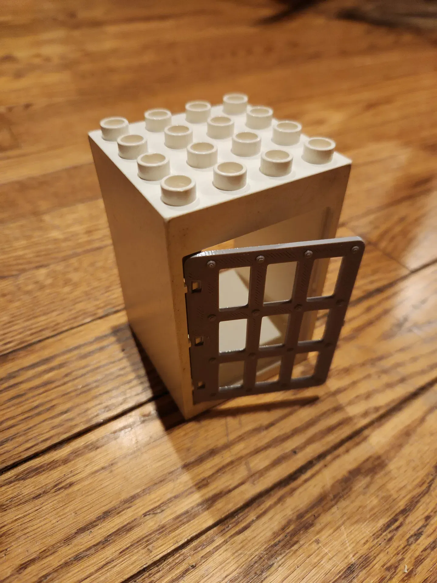 Đây là tấm cửa/cửa sổ song sắt thay thế, tương thích hoàn hảo với các loại gạch lắp ráp kiểu Duplo.
