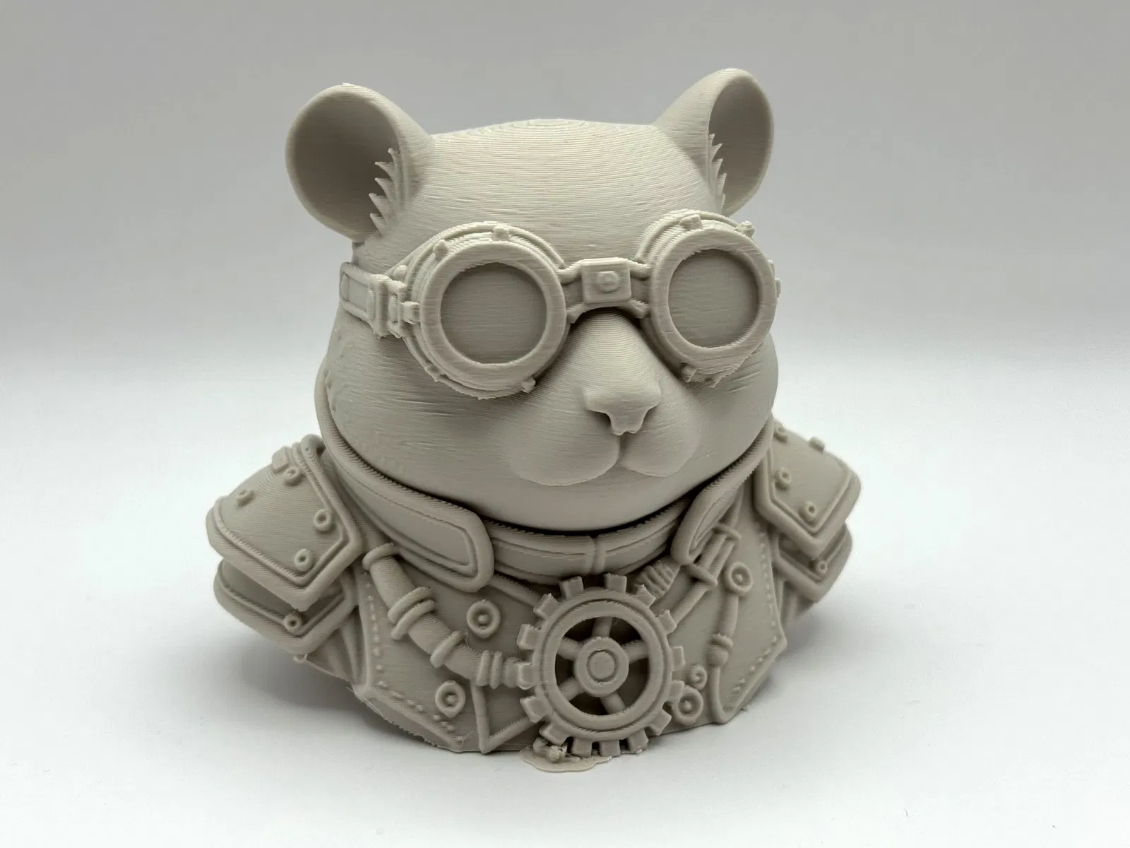 Gặp gỡ chàng kỹ sư nhỏ dũng cảm nhất trong thế giới steampunk! Mẫu tượng bán thân chú chuột hamster vô cùng chi tiết này là sự kết hợp giữa vẻ ngoài tròn trịa đáng yêu và nét quyến rũ công nghiệp—với đầy đủ các chi tiết giáp đinh tán, hệ thống bánh răng, cùng chiếc kính bảo hộ steampunk cỡ lớn sẵn sàng để quan sát chân trời cho mọi cuộc phiêu lưu.